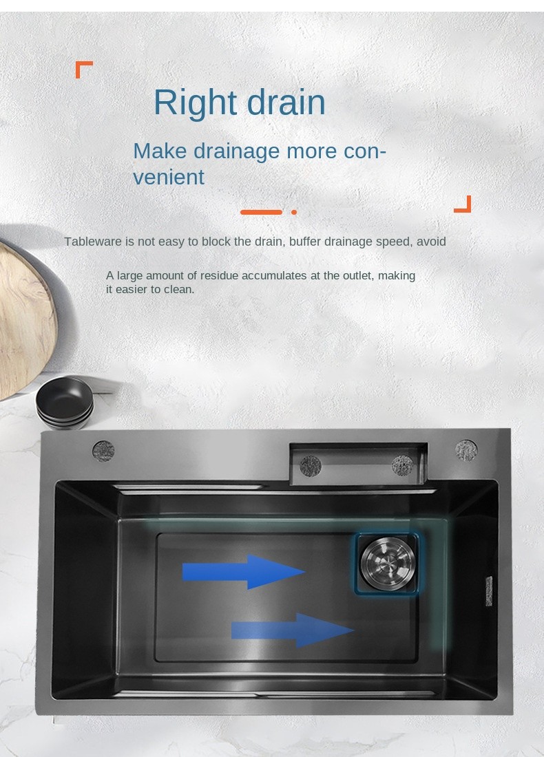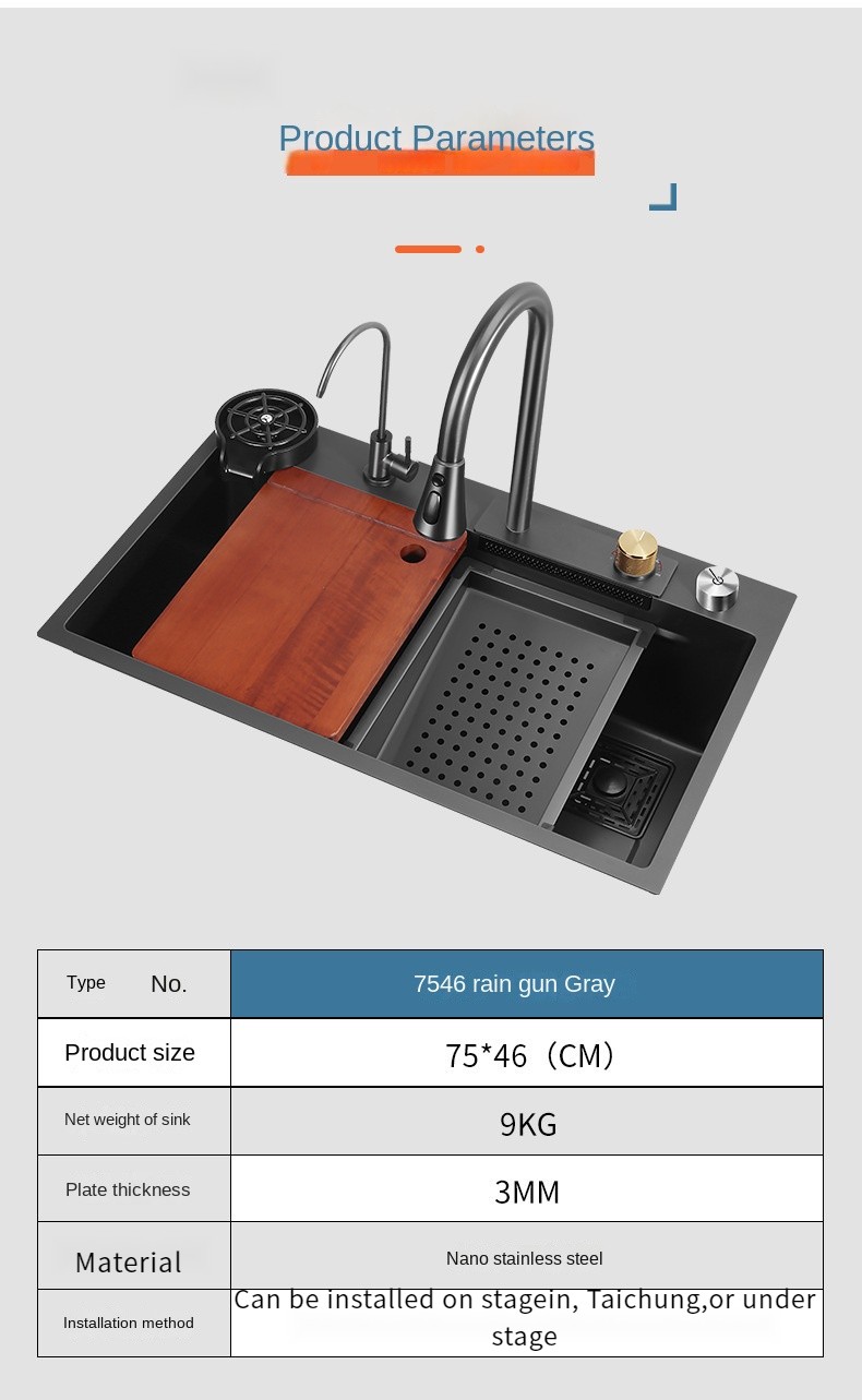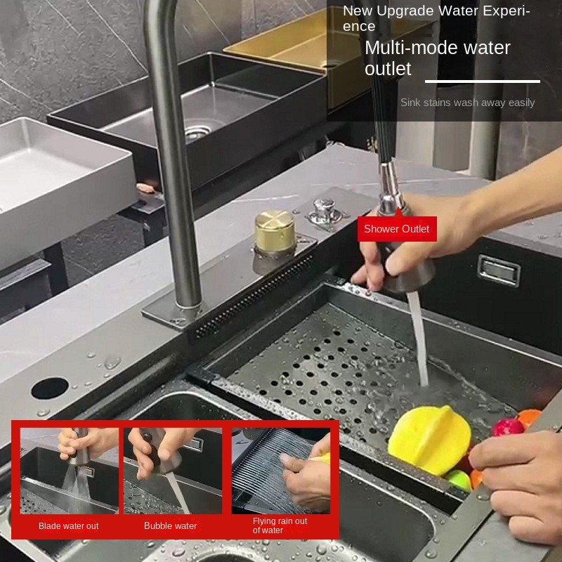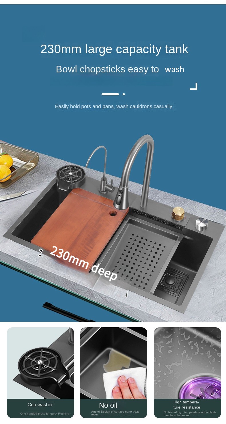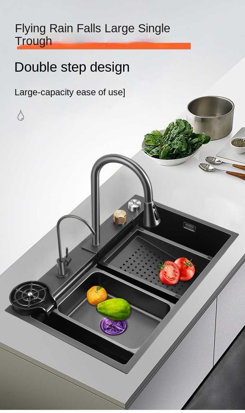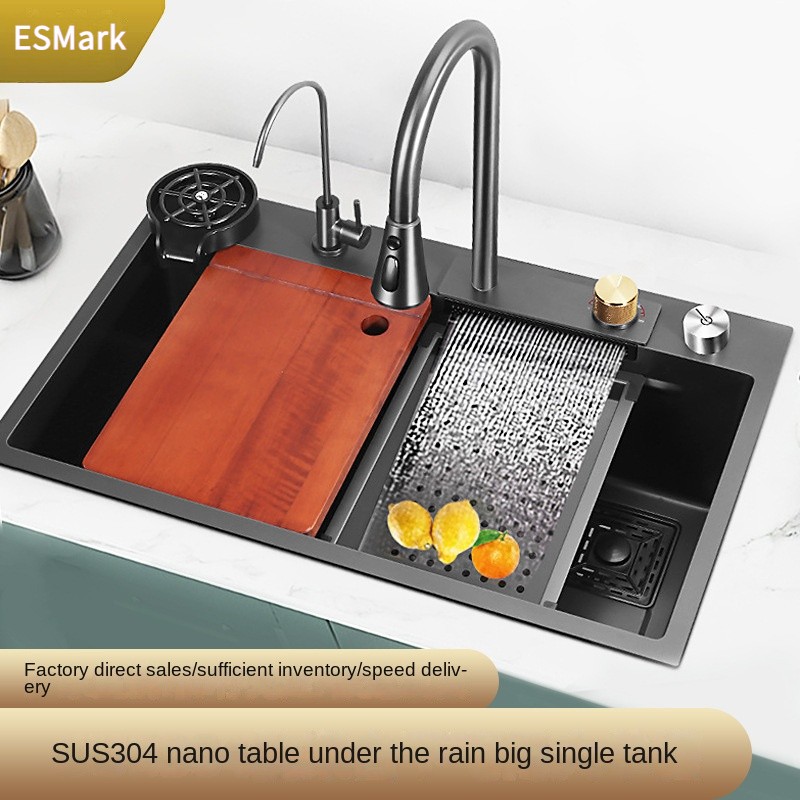 The ESMark™ 304 Stainless Steel Sink with Flying Rain Falls large single trough design offers an unparalleled kitchen cleaning experience. Made from high-quality nano stainless steel, this sink is not only resistant to oil and stains but also durable and scratch-resistant, ensuring long-lasting beauty. Its flexible design and multifunctional configuration significantly enhance both usability and comfort in the kitchen.