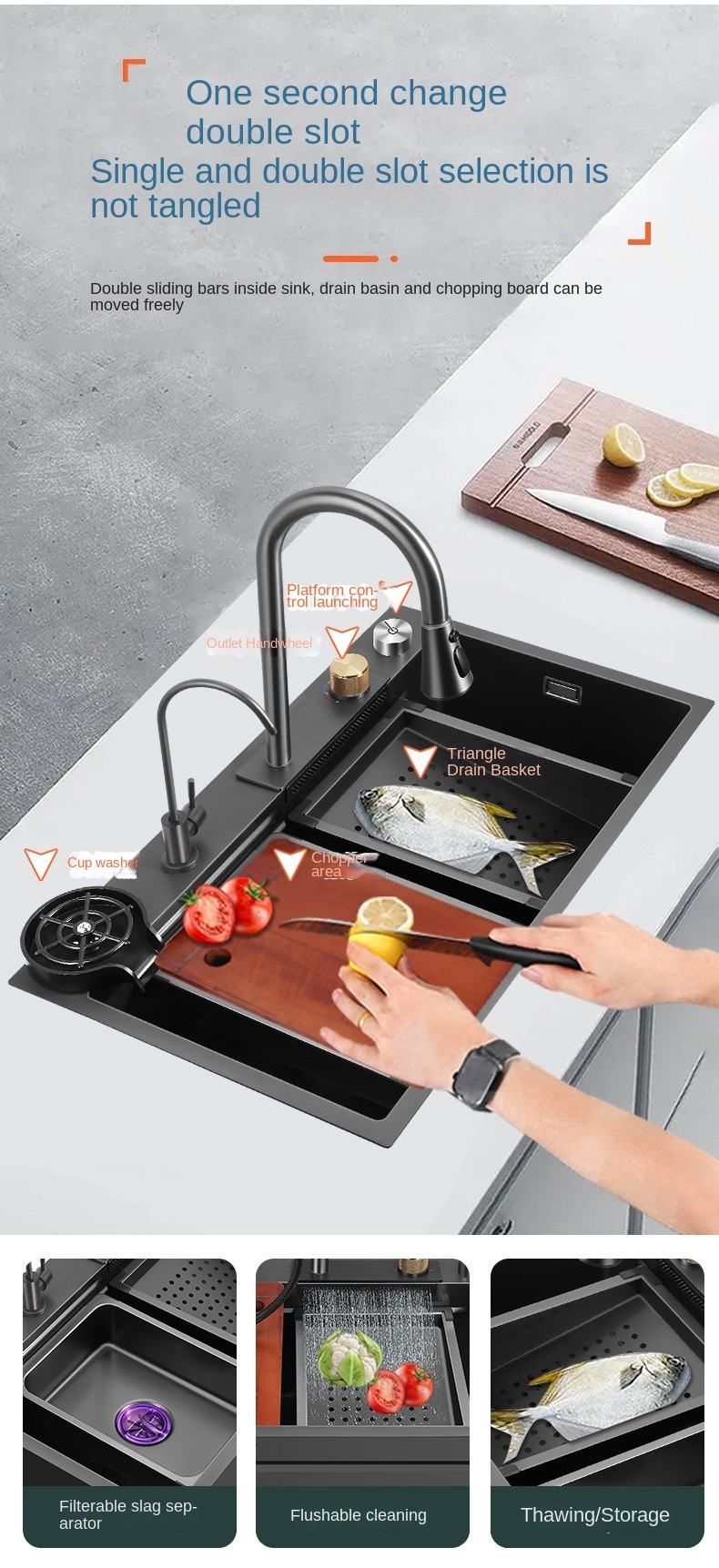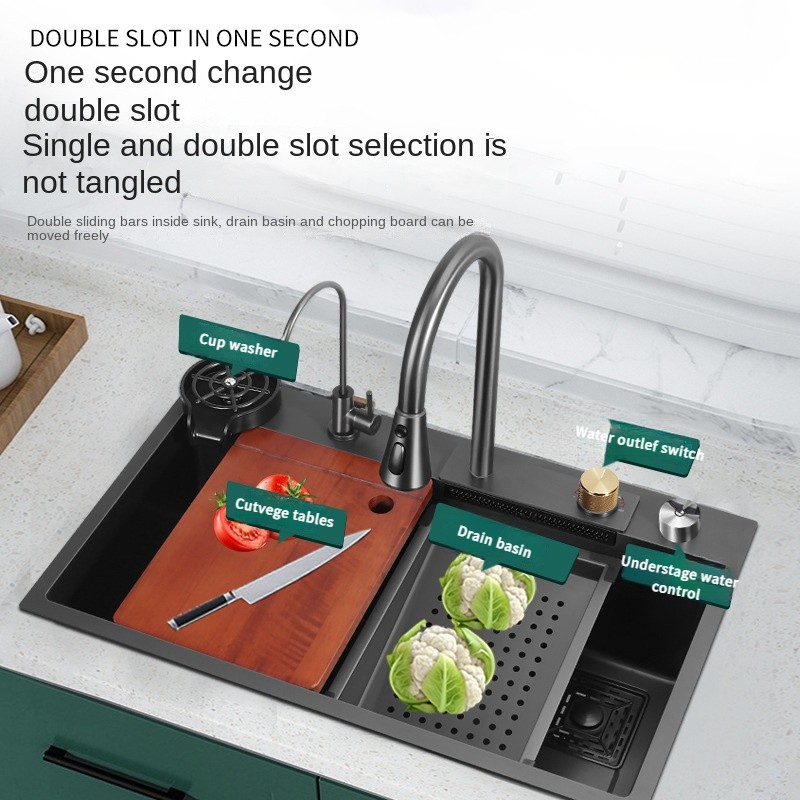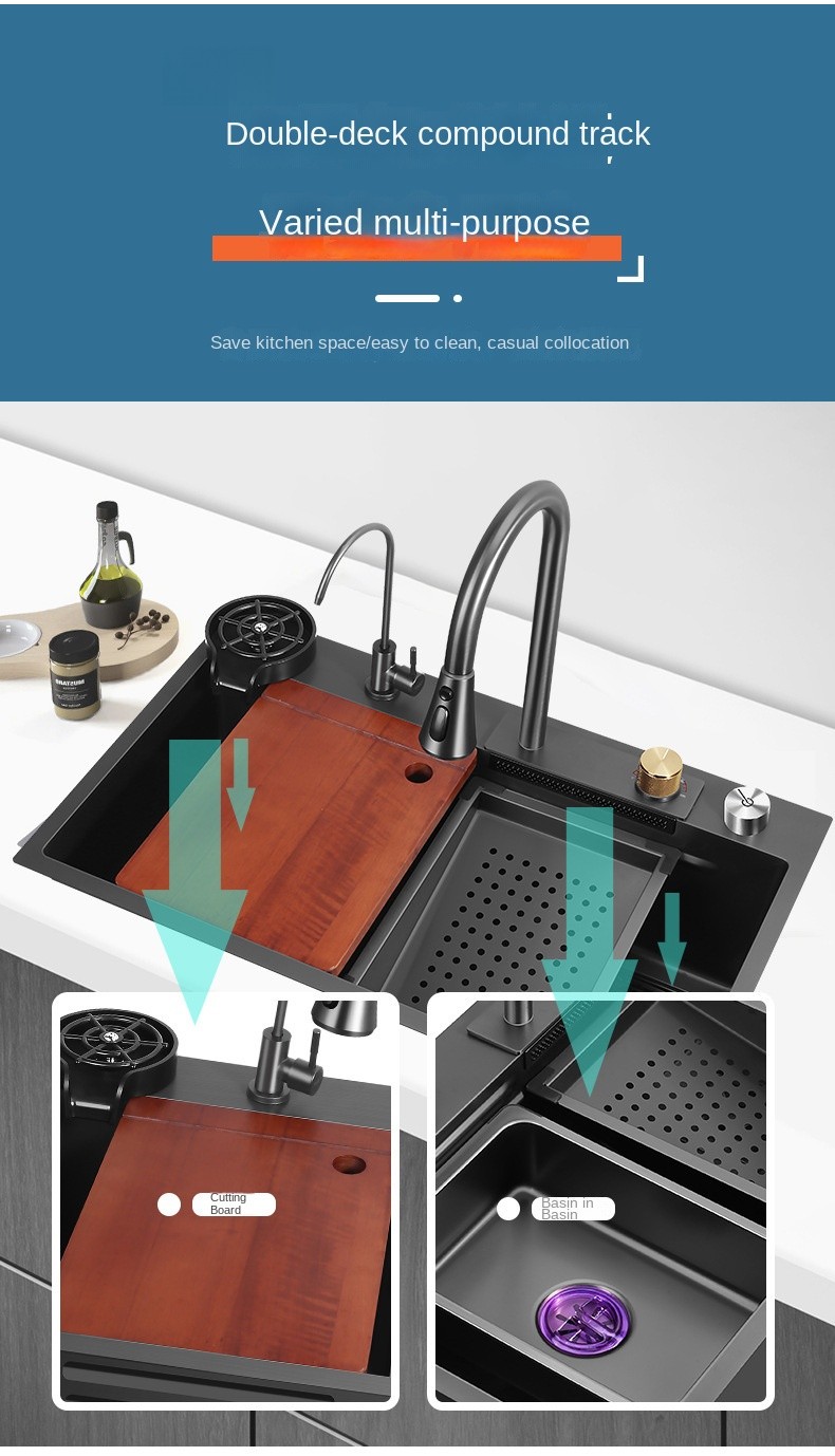 • Double-Deck Compound Track: With double sliding rails inside the sink, the drain basin and cutting board can be moved freely, maximizing space and improving efficiency during kitchen tasks.