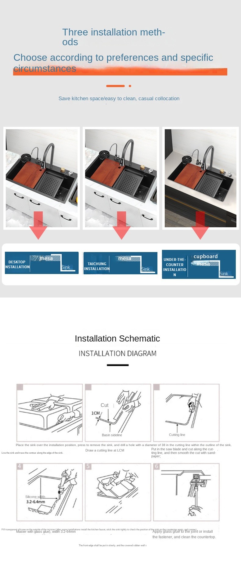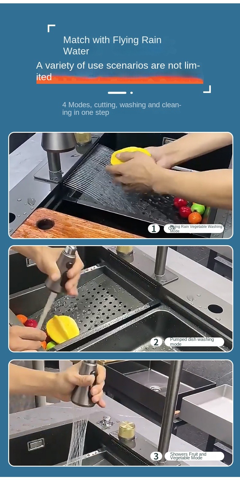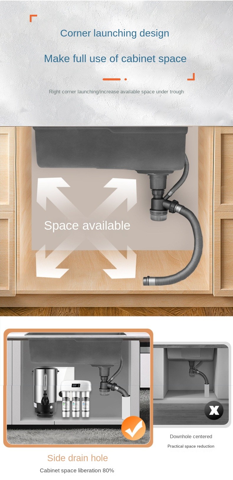 • Double-Deck Compound Track: With double sliding rails inside the sink, the drain basin and cutting board can be moved freely, maximizing space and improving efficiency during kitchen tasks.