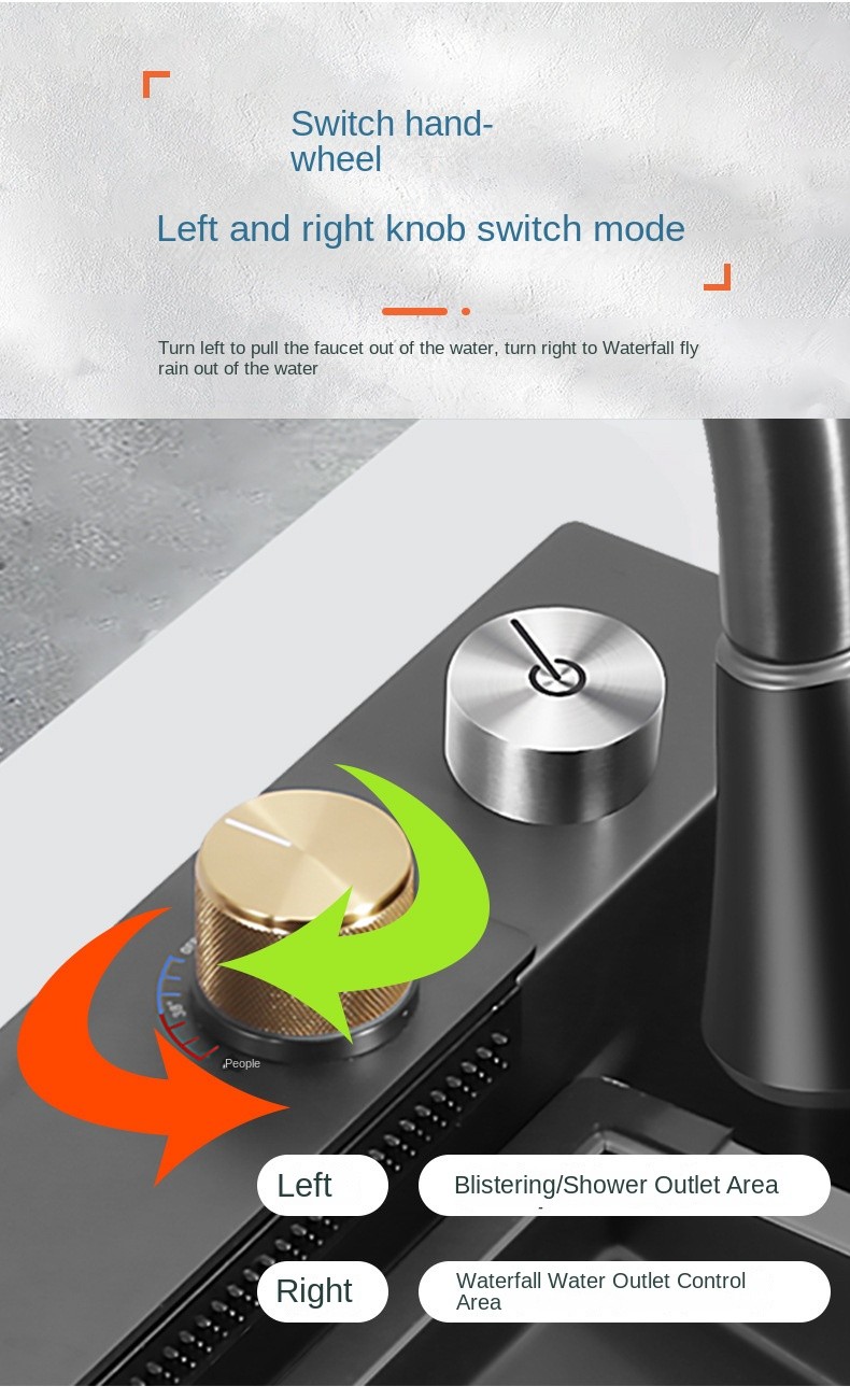 • Switch Hand-Wheel: The left and right knob switch allows you to toggle between different water modes effortlessly. Turn left to pull out the faucet for regular water flow, and turn right for the Flying Rain waterfall mode, offering versatile use for various scenarios.