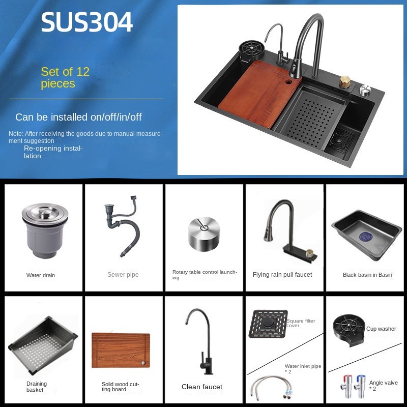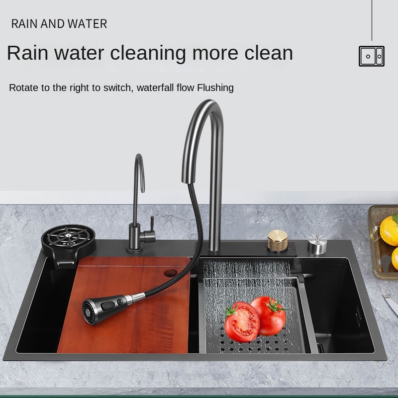 • Flying Rain Falls Large Single Trough Design: Featuring a unique waterfall-style water outlet and a large capacity trough, this sink easily handles large dishes and food preparation needs, making it versatile for any kitchen task.