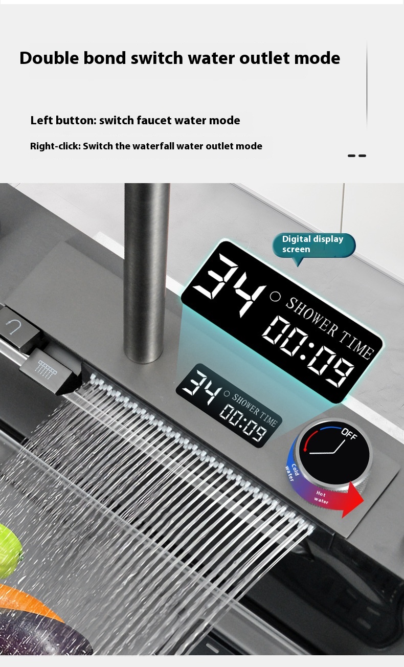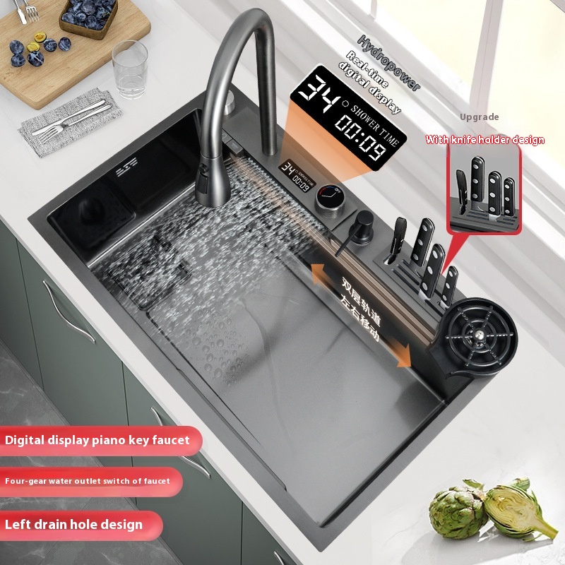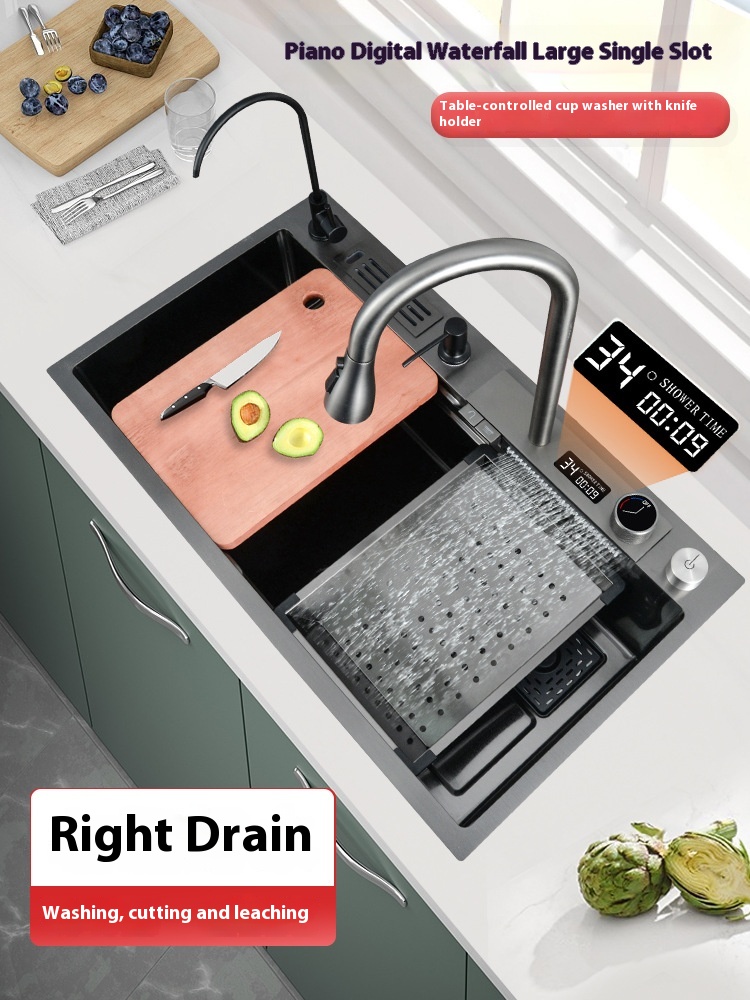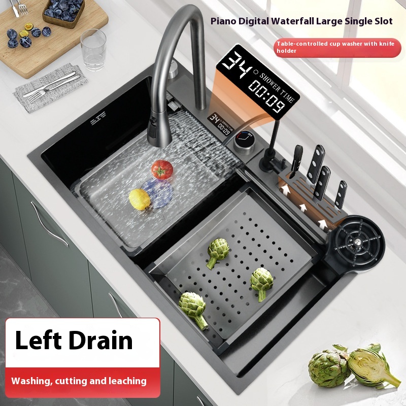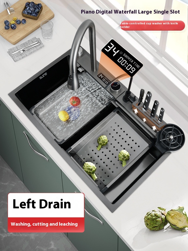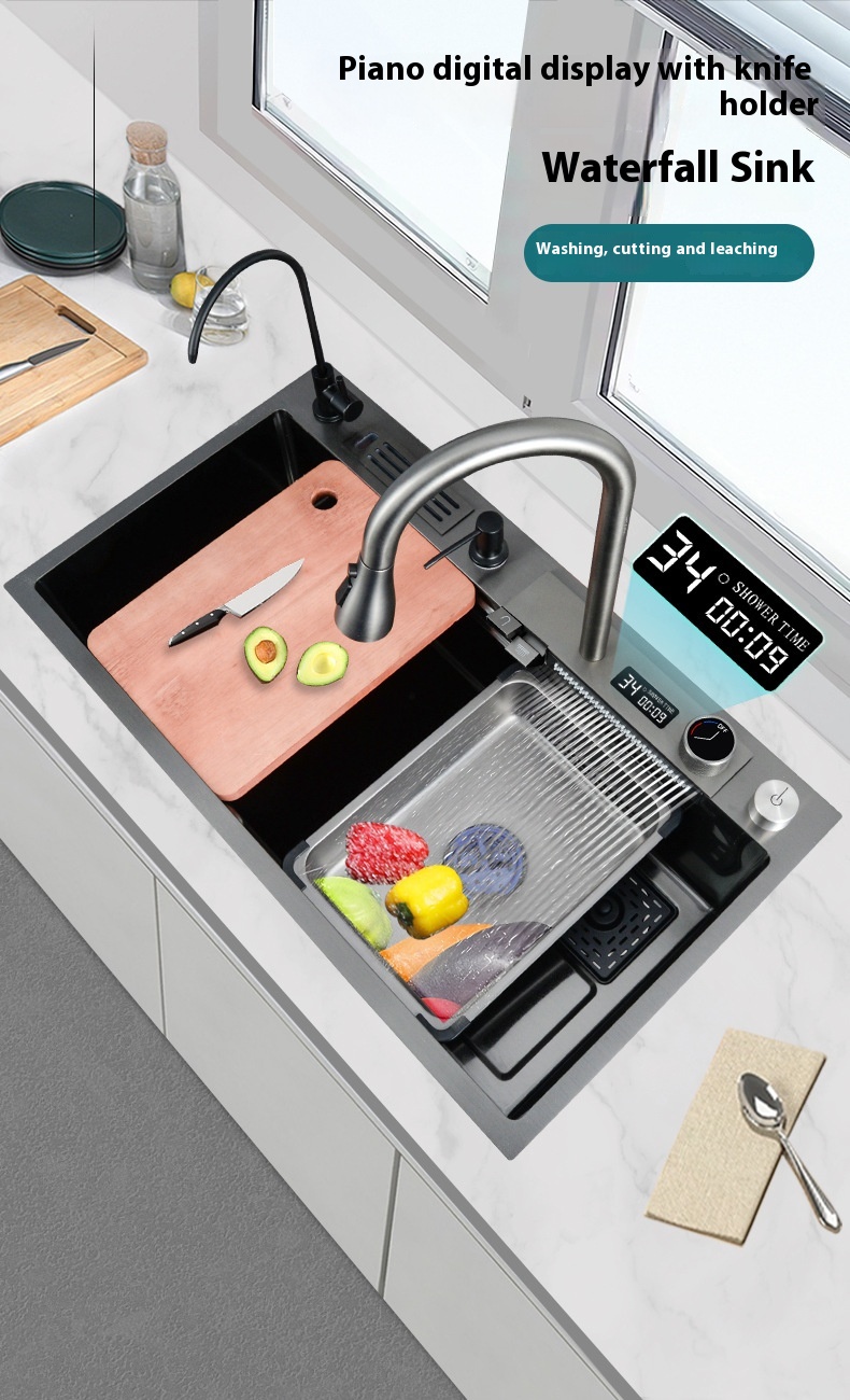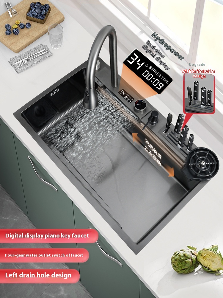 The ESMark™ Black Waterfall Display Stainless Steel Sink elevates kitchen cleaning to a whole new level. Combining washing, cutting, and draining functionalities, it features a piano digital display faucet that is both practical and stylish. The sink is designed with a large single slot, integrated knife holder, and table-controlled cup washer for added convenience and efficiency. The four-gear faucet water outlet mode and adjustable hot/cold water functionality allow users to switch modes based on their needs, eliminating concerns of hand burns while washing dishes. The waterfall-style outlet ensures easy and efficient cleaning, with a wide water flow that covers a large area for quick and thorough washing of fruits, vegetables, and dishes.