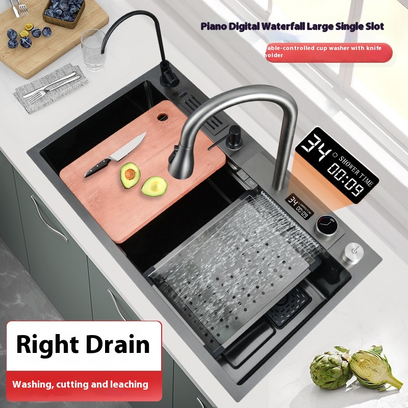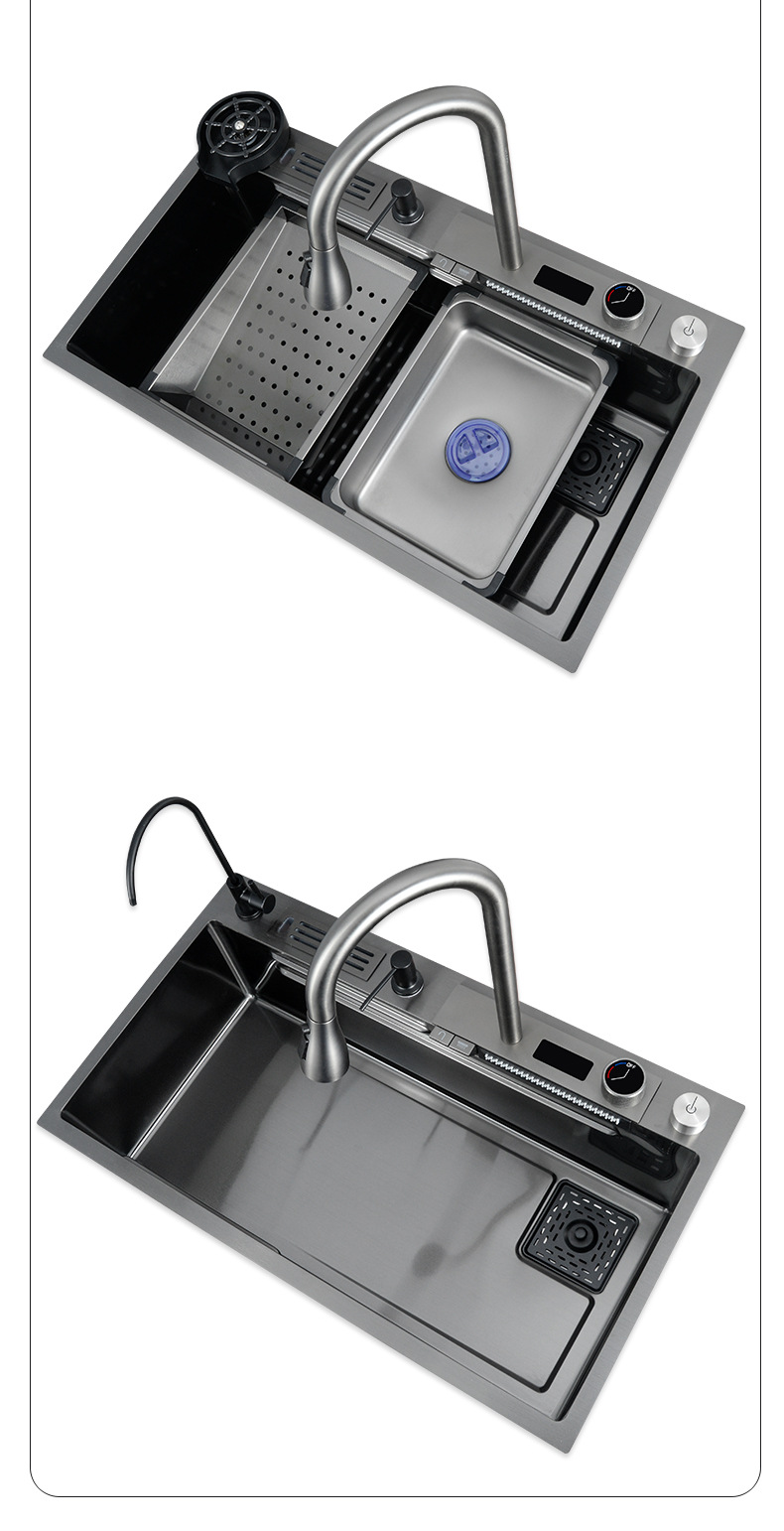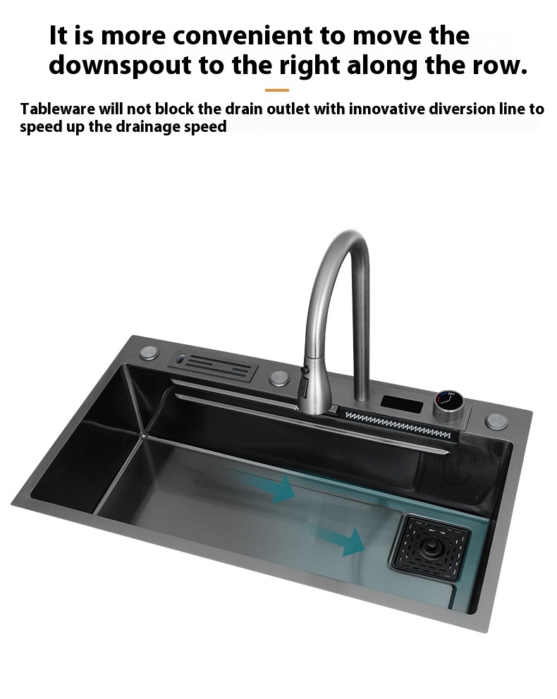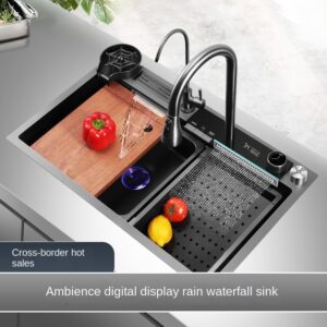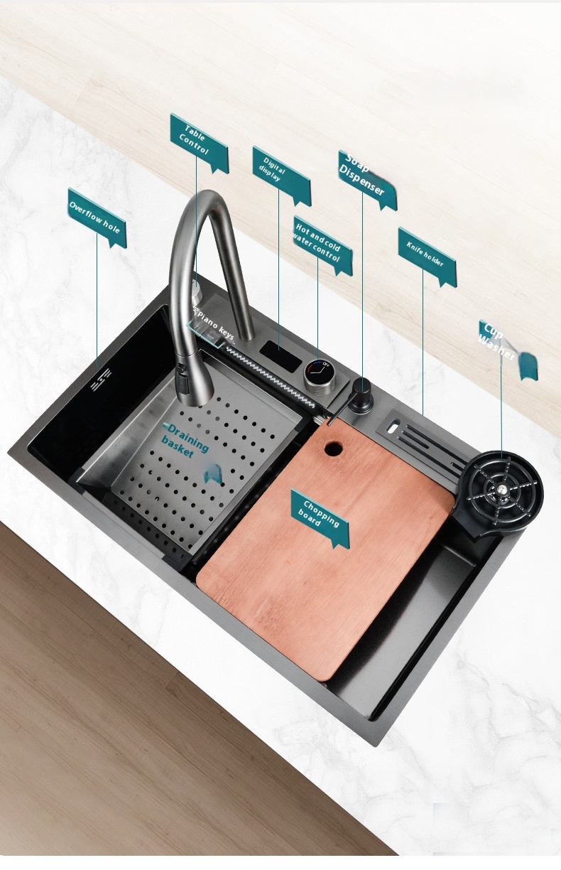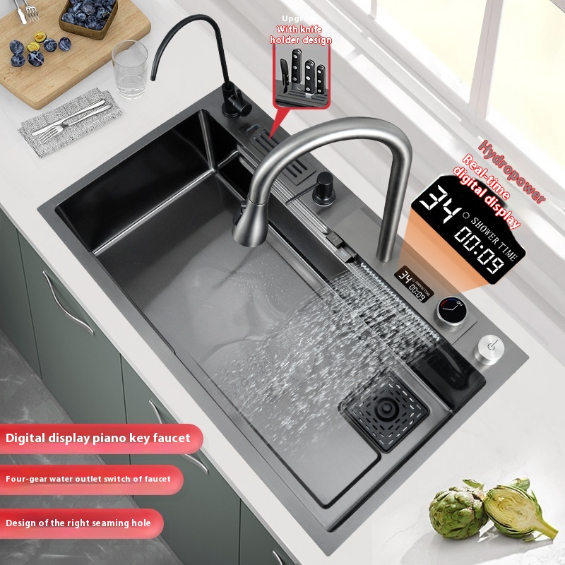 The ESMark™ Black Waterfall Display Stainless Steel Sink elevates kitchen cleaning to a whole new level. Combining washing, cutting, and draining functionalities, it features a piano digital display faucet that is both practical and stylish. The sink is designed with a large single slot, integrated knife holder, and table-controlled cup washer for added convenience and efficiency. The four-gear faucet water outlet mode and adjustable hot/cold water functionality allow users to switch modes based on their needs, eliminating concerns of hand burns while washing dishes. The waterfall-style outlet ensures easy and efficient cleaning, with a wide water flow that covers a large area for quick and thorough washing of fruits, vegetables, and dishes.