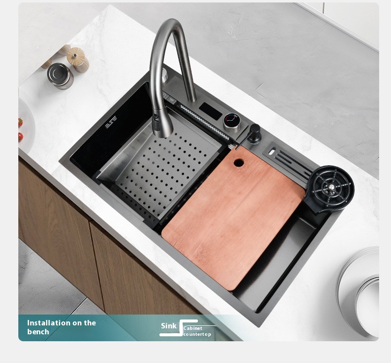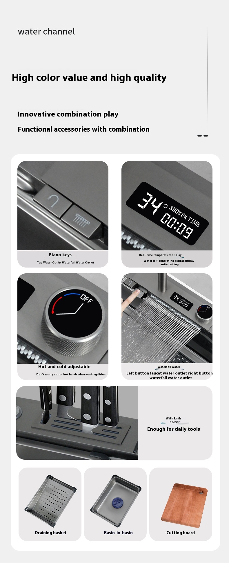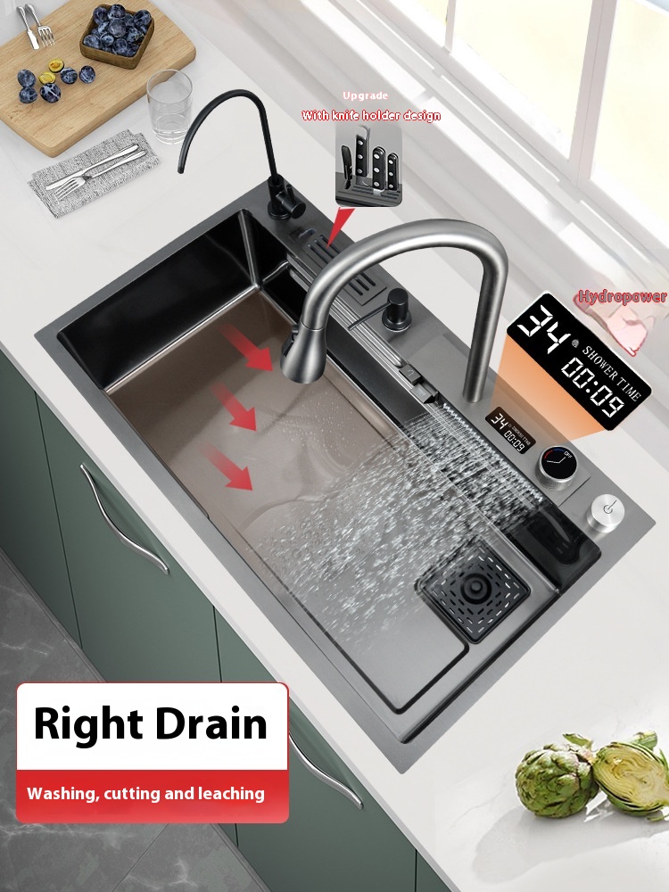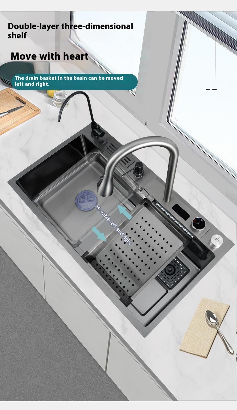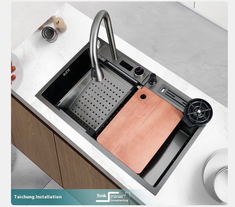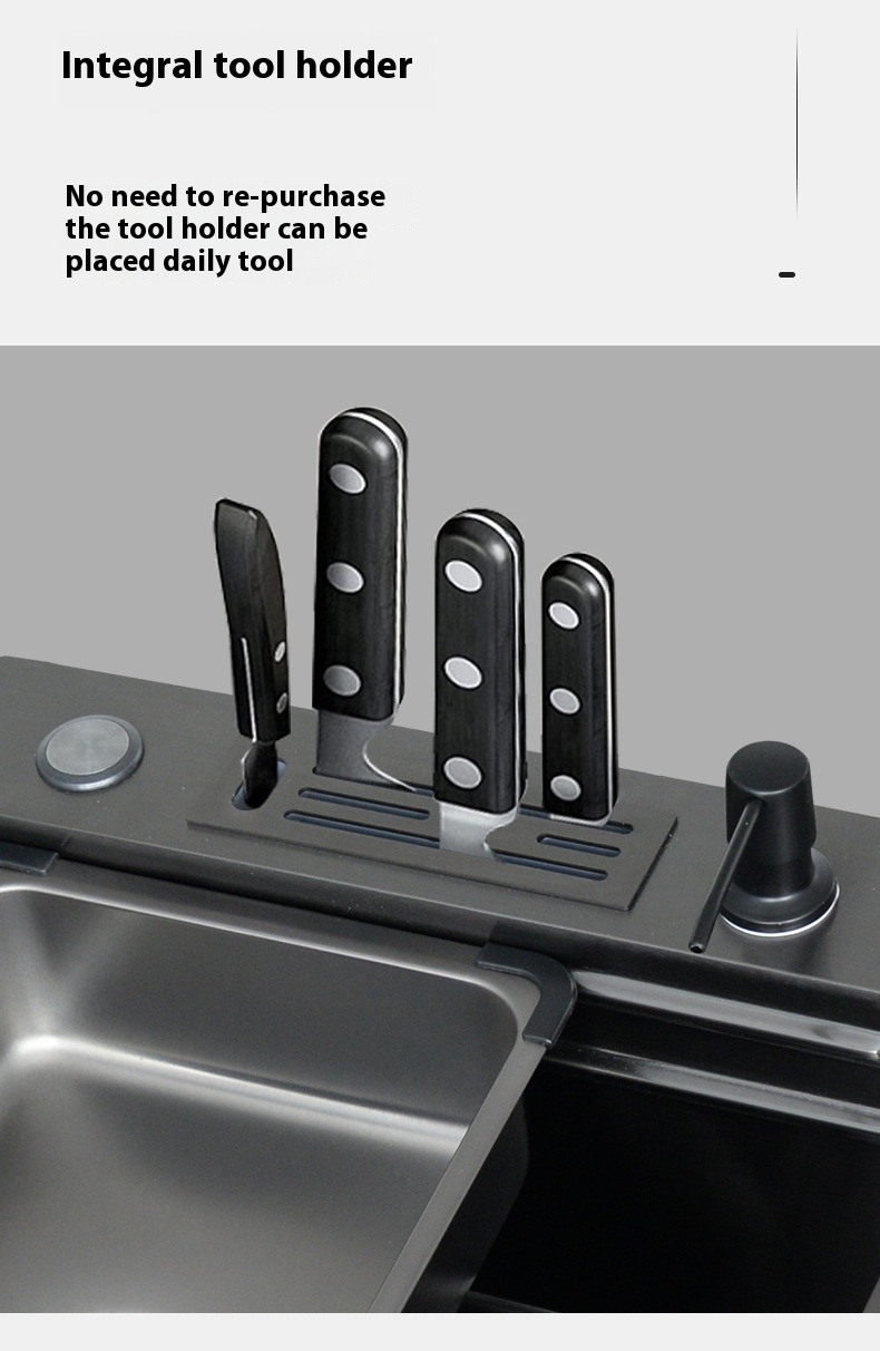 The ESMark™ Black Waterfall Display Stainless Steel Sink elevates kitchen cleaning to a whole new level. Combining washing, cutting, and draining functionalities, it features a piano digital display faucet that is both practical and stylish. The sink is designed with a large single slot, integrated knife holder, and table-controlled cup washer for added convenience and efficiency. The four-gear faucet water outlet mode and adjustable hot/cold water functionality allow users to switch modes based on their needs, eliminating concerns of hand burns while washing dishes. The waterfall-style outlet ensures easy and efficient cleaning, with a wide water flow that covers a large area for quick and thorough washing of fruits, vegetables, and dishes.