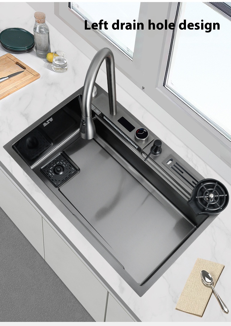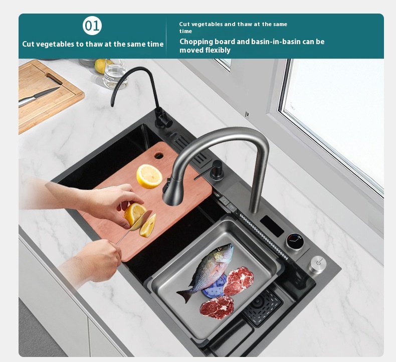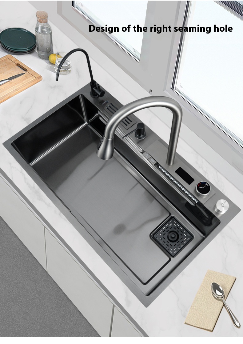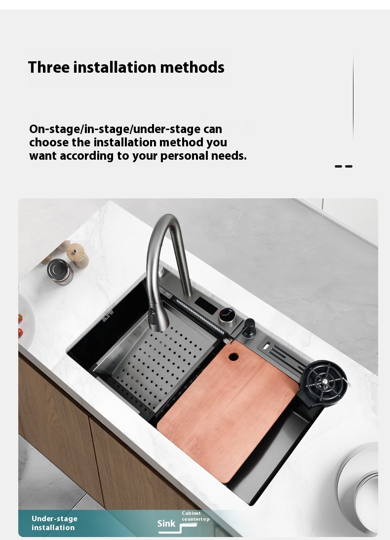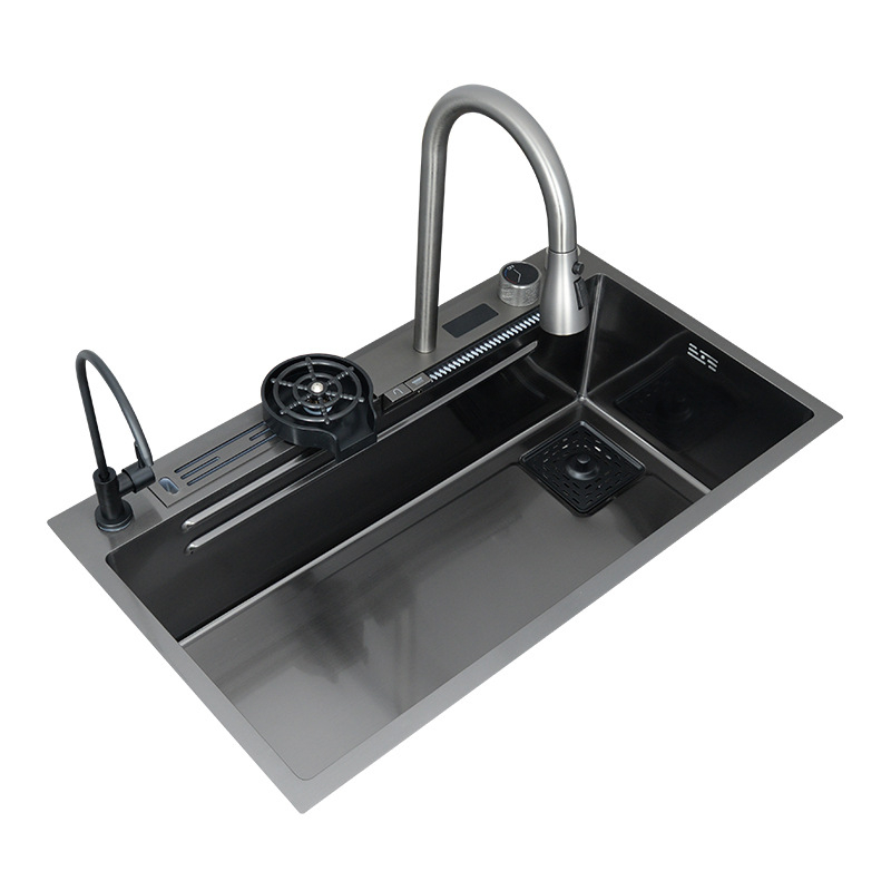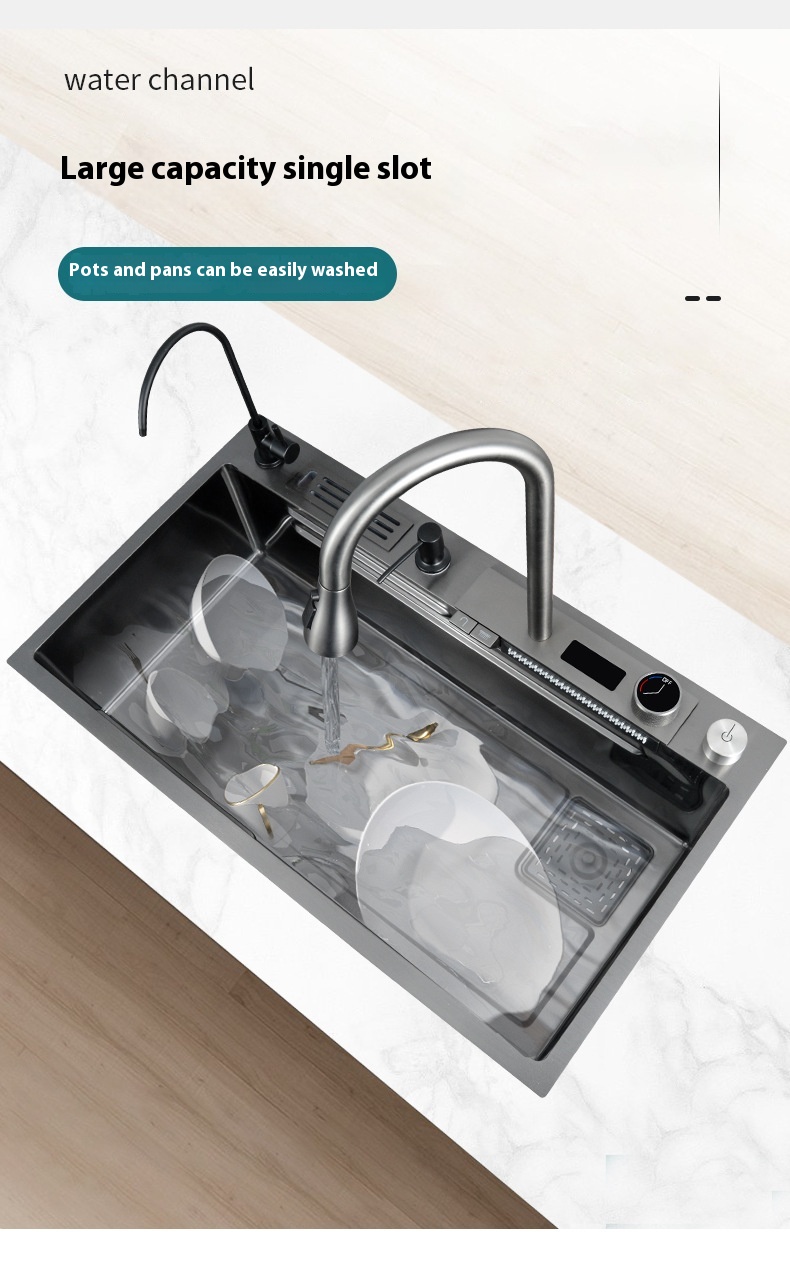 The ESMark™ Black Waterfall Display Stainless Steel Sink elevates kitchen cleaning to a whole new level. Combining washing, cutting, and draining functionalities, it features a piano digital display faucet that is both practical and stylish. The sink is designed with a large single slot, integrated knife holder, and table-controlled cup washer for added convenience and efficiency. The four-gear faucet water outlet mode and adjustable hot/cold water functionality allow users to switch modes based on their needs, eliminating concerns of hand burns while washing dishes. The waterfall-style outlet ensures easy and efficient cleaning, with a wide water flow that covers a large area for quick and thorough washing of fruits, vegetables, and dishes.