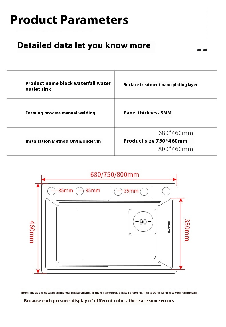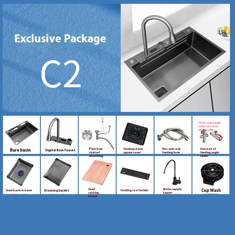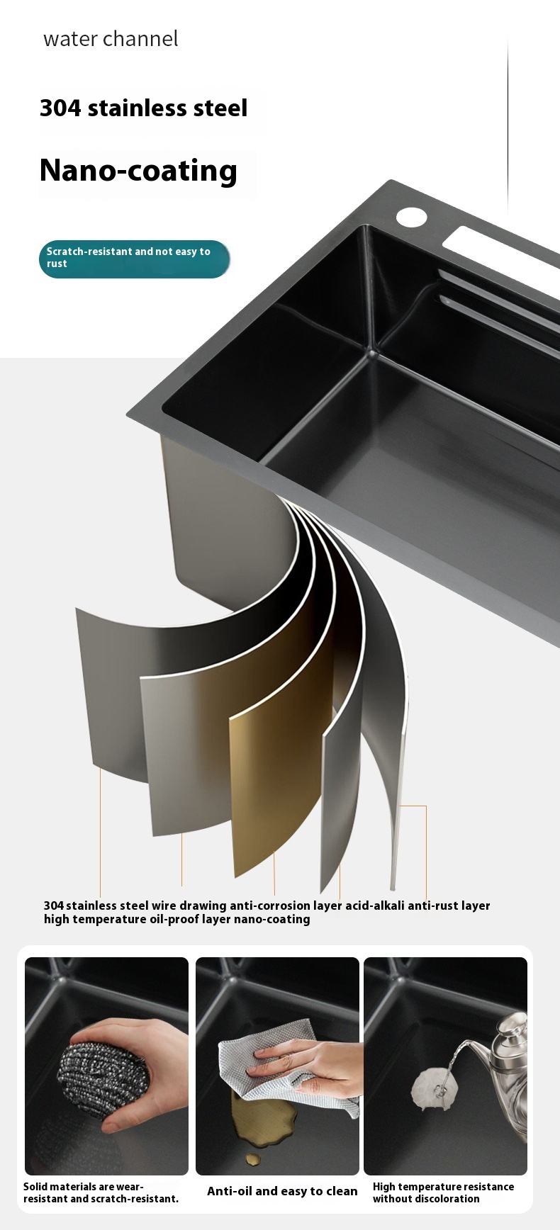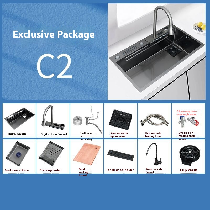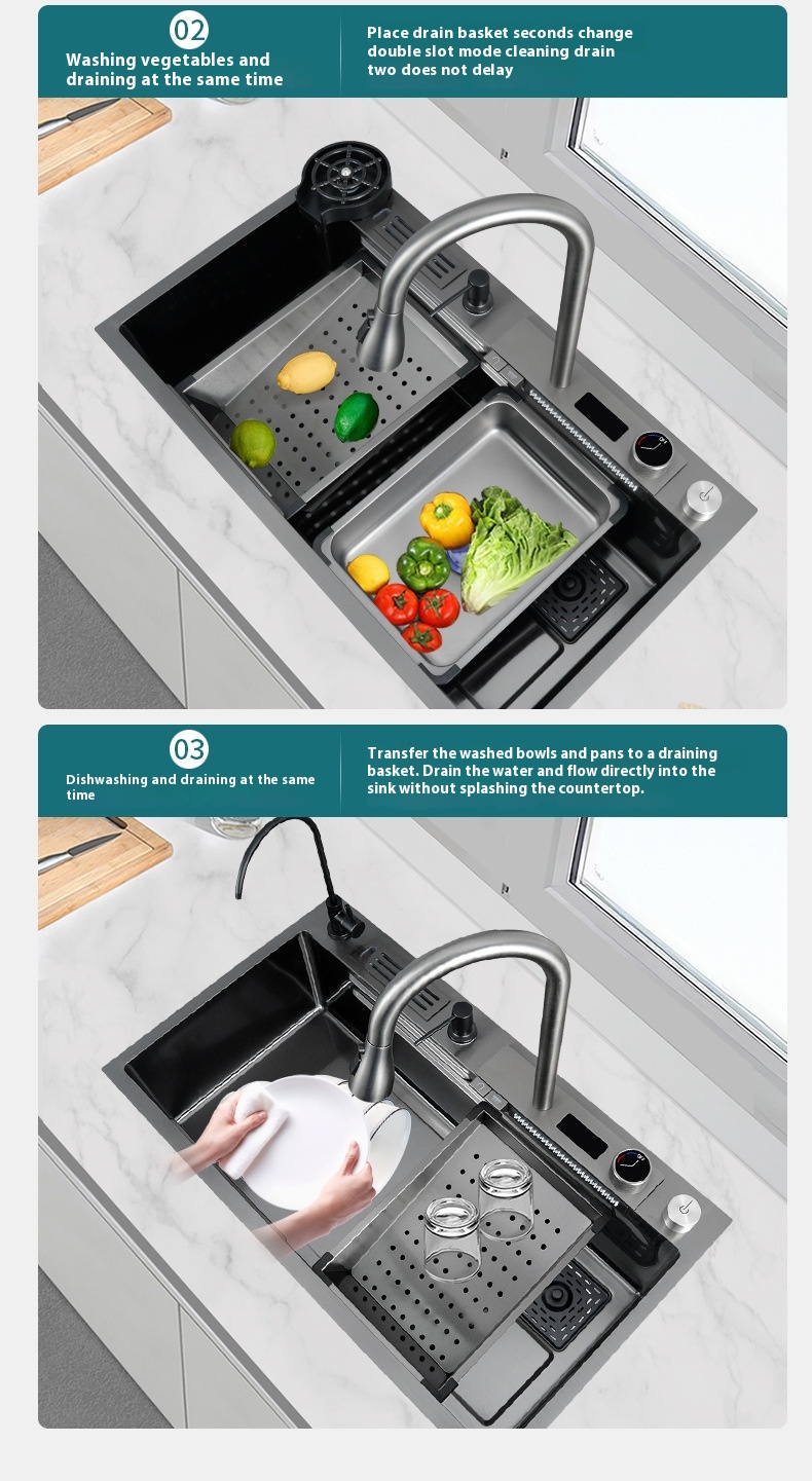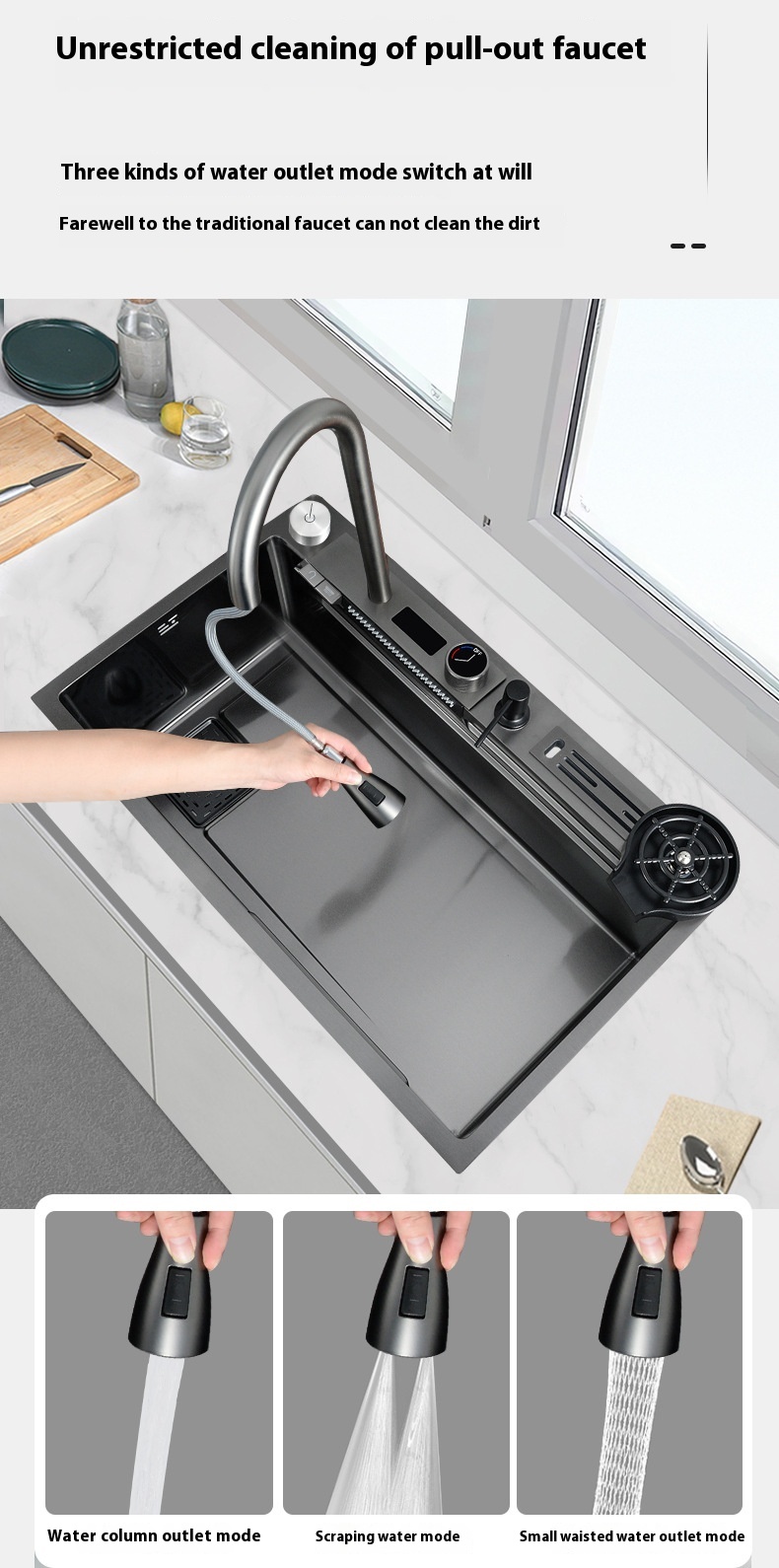 The ESMark™ Black Waterfall Display Stainless Steel Sink elevates kitchen cleaning to a whole new level. Combining washing, cutting, and draining functionalities, it features a piano digital display faucet that is both practical and stylish. The sink is designed with a large single slot, integrated knife holder, and table-controlled cup washer for added convenience and efficiency. The four-gear faucet water outlet mode and adjustable hot/cold water functionality allow users to switch modes based on their needs, eliminating concerns of hand burns while washing dishes. The waterfall-style outlet ensures easy and efficient cleaning, with a wide water flow that covers a large area for quick and thorough washing of fruits, vegetables, and dishes.