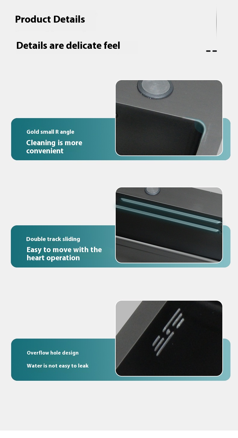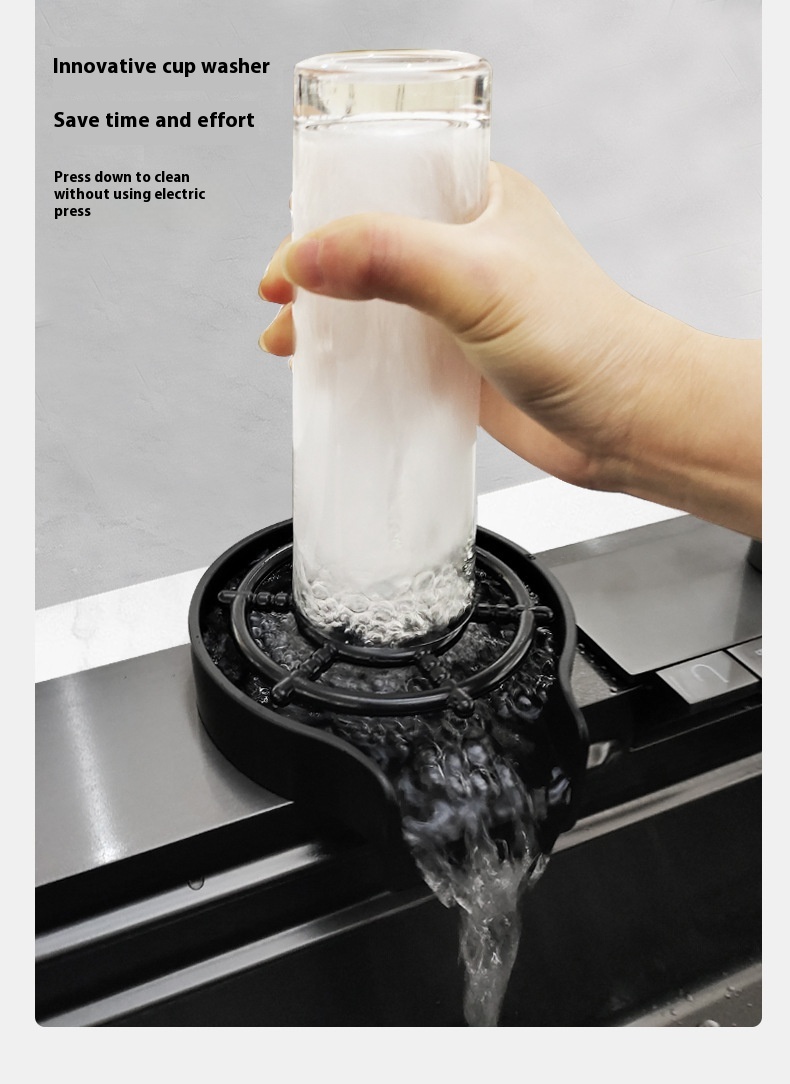 This sink incorporates innovative multi-functional accessories such as a double-layer three-dimensional shelf that can be moved left or right to offer greater operational flexibility. The left or right drain hole design enhances usability, and the waterfall and traditional faucet outlets can be effortlessly switched with piano keys to cater to different cleaning needs. The innovative table-controlled cup washer allows for fast, electric-free cleaning by simply pressing down, saving both time and effort.