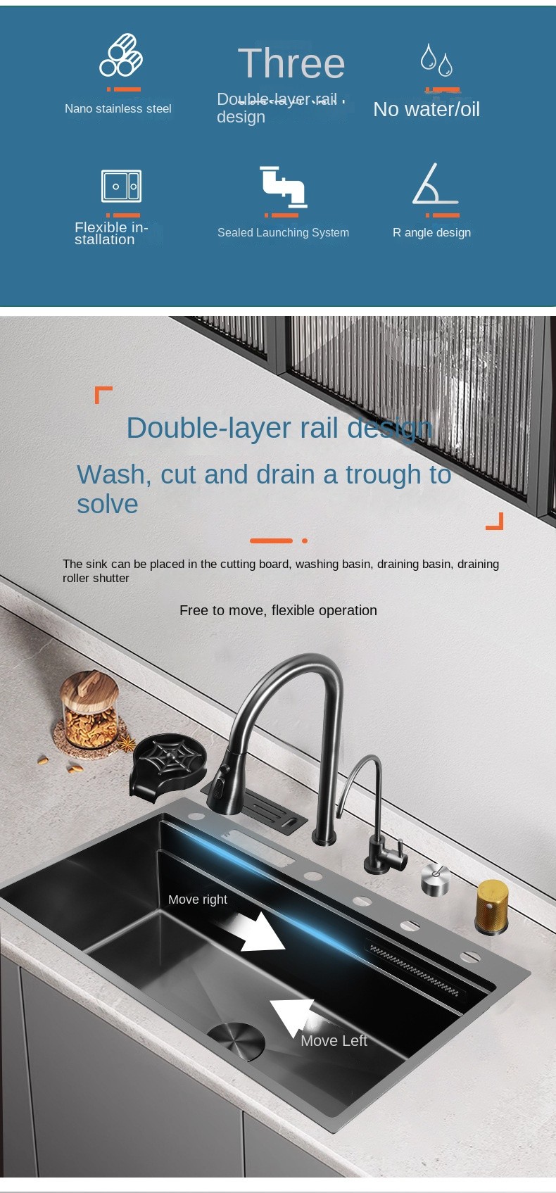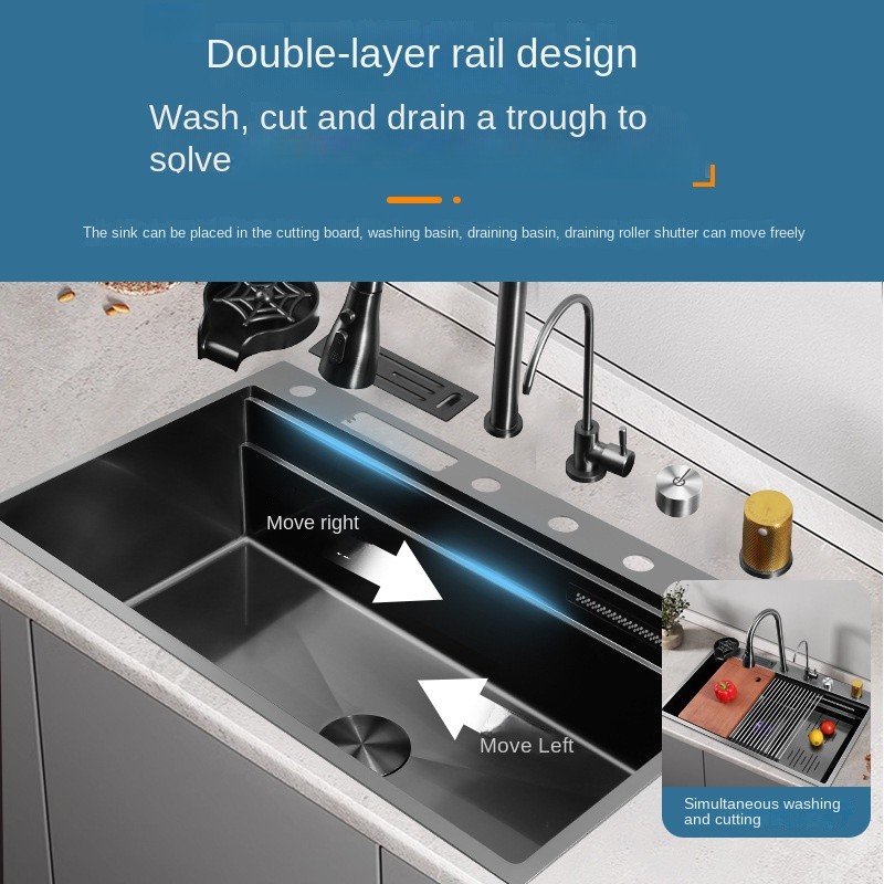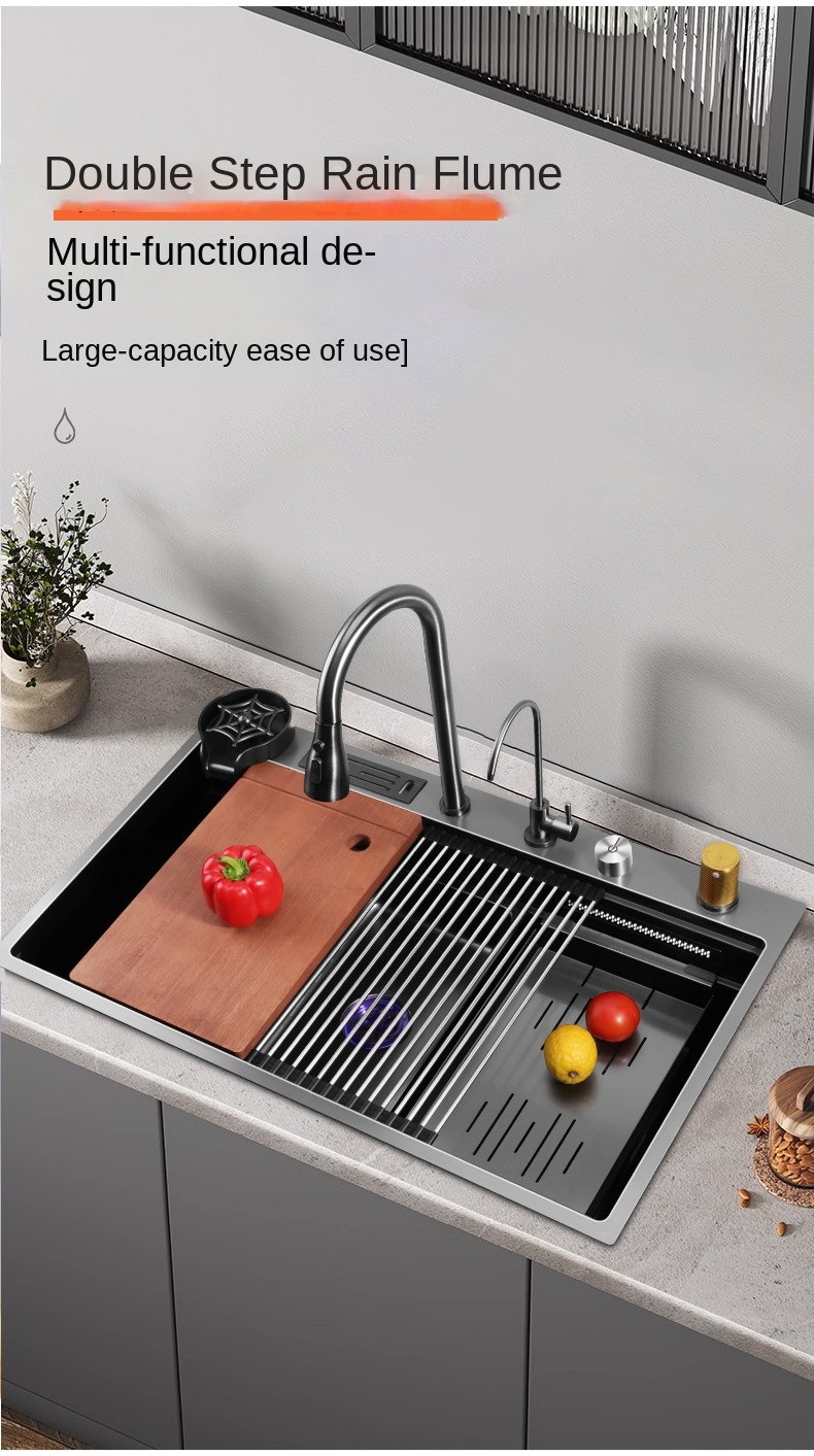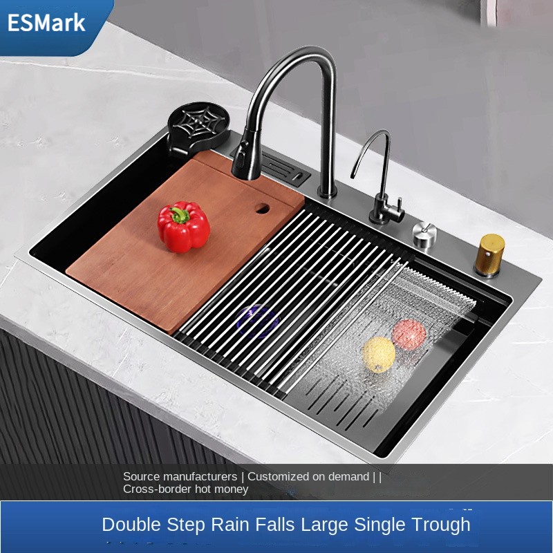 The ESMark™ Large Capacity Multifunctional Double Step Sink is a cutting-edge, multifunctional sink designed to enhance the efficiency and convenience of modern kitchens. Its large capacity and versatile features make it a comprehensive solution for various kitchen tasks.