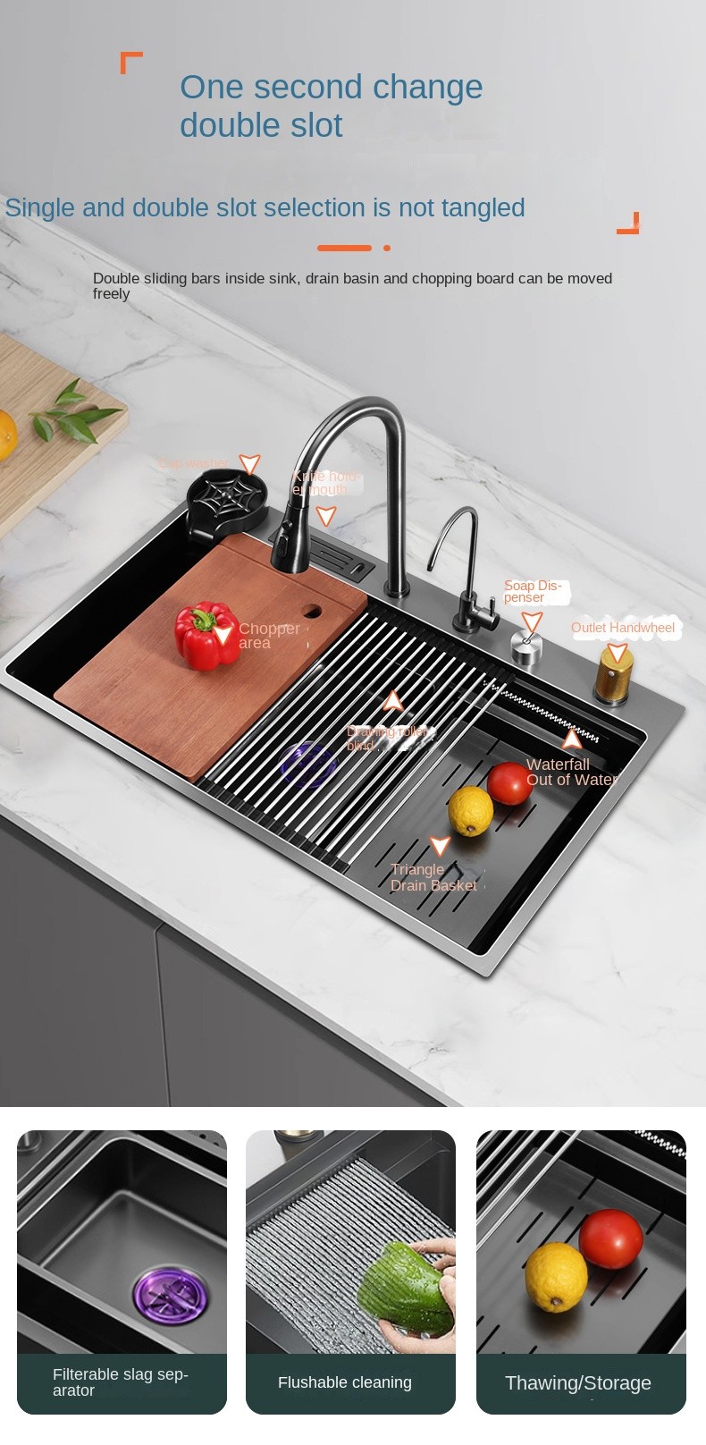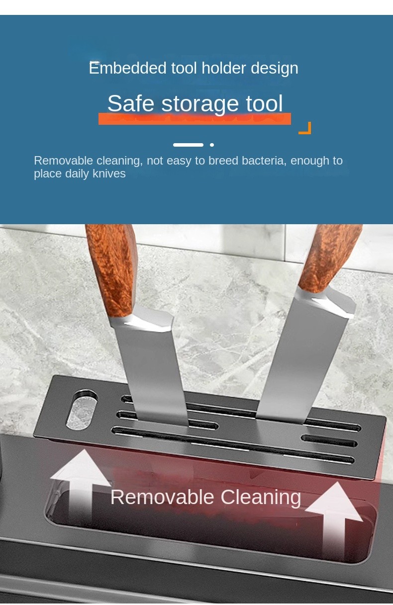 - Movable Double Sliding Bars: Equipped with double sliding bars inside, allowing the drain basin and chopping board to move freely for added flexibility.