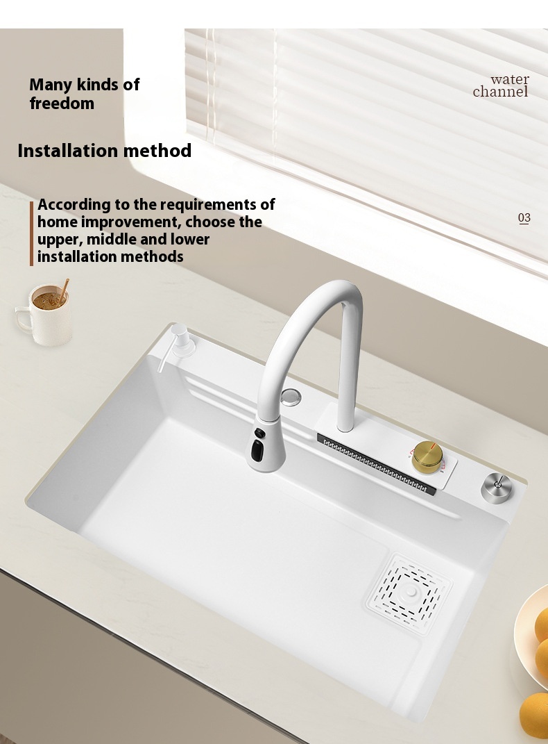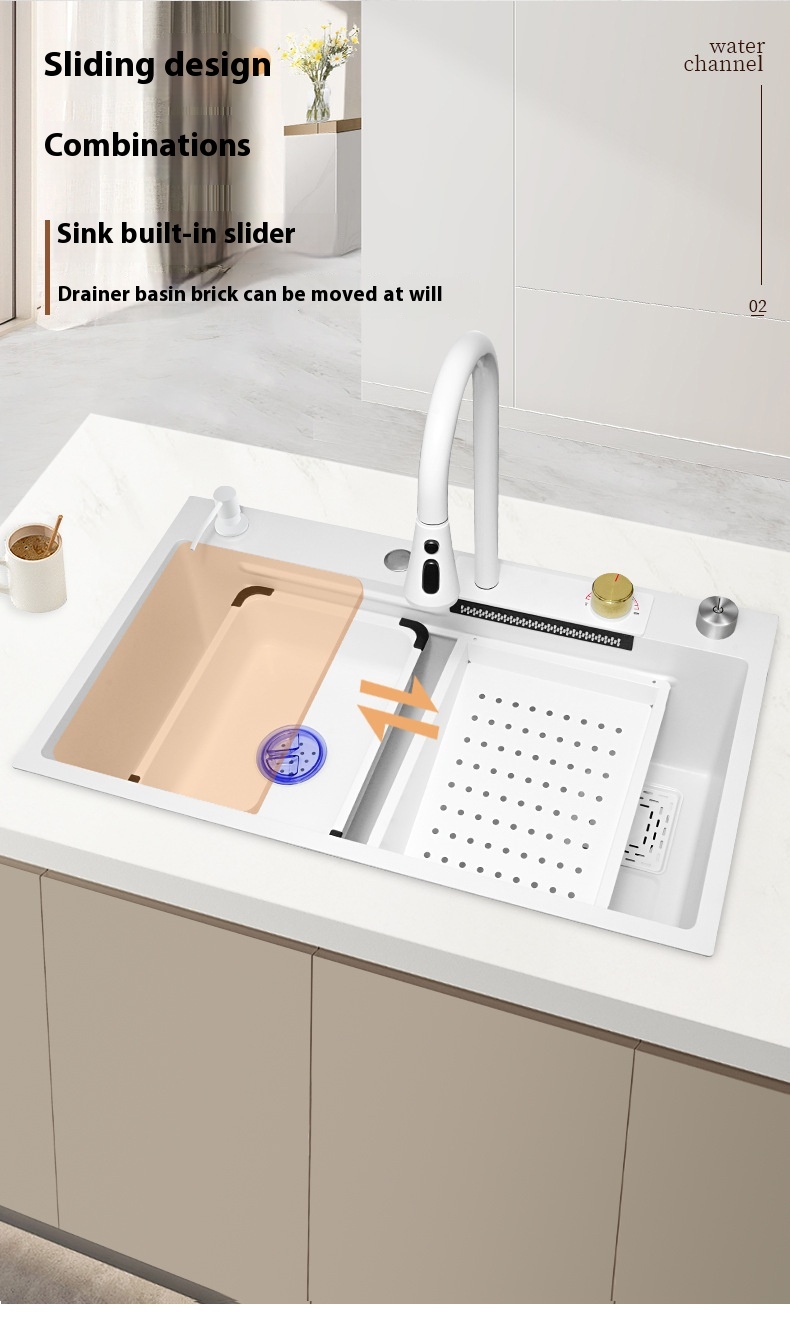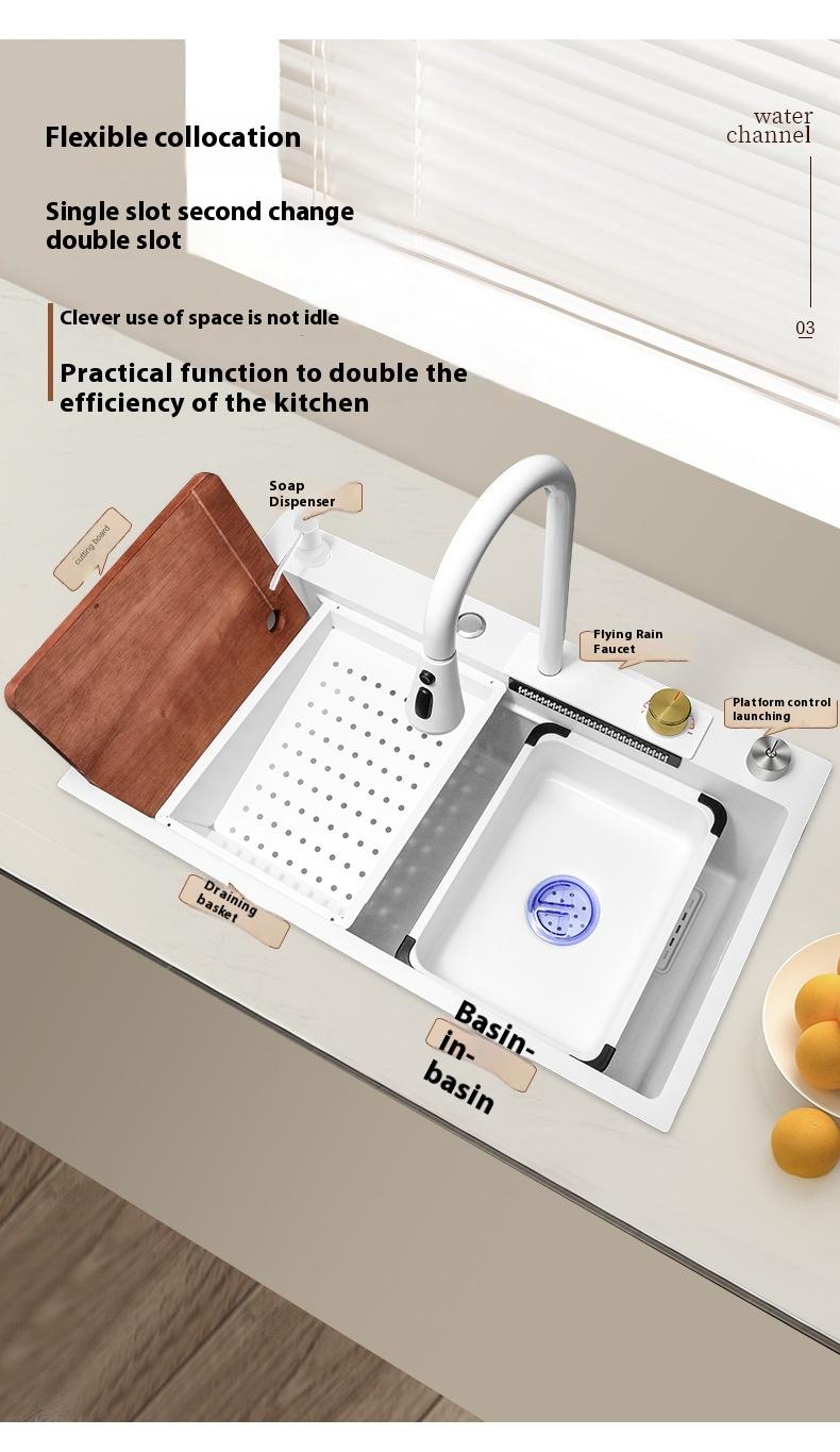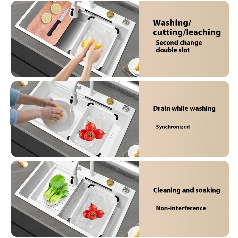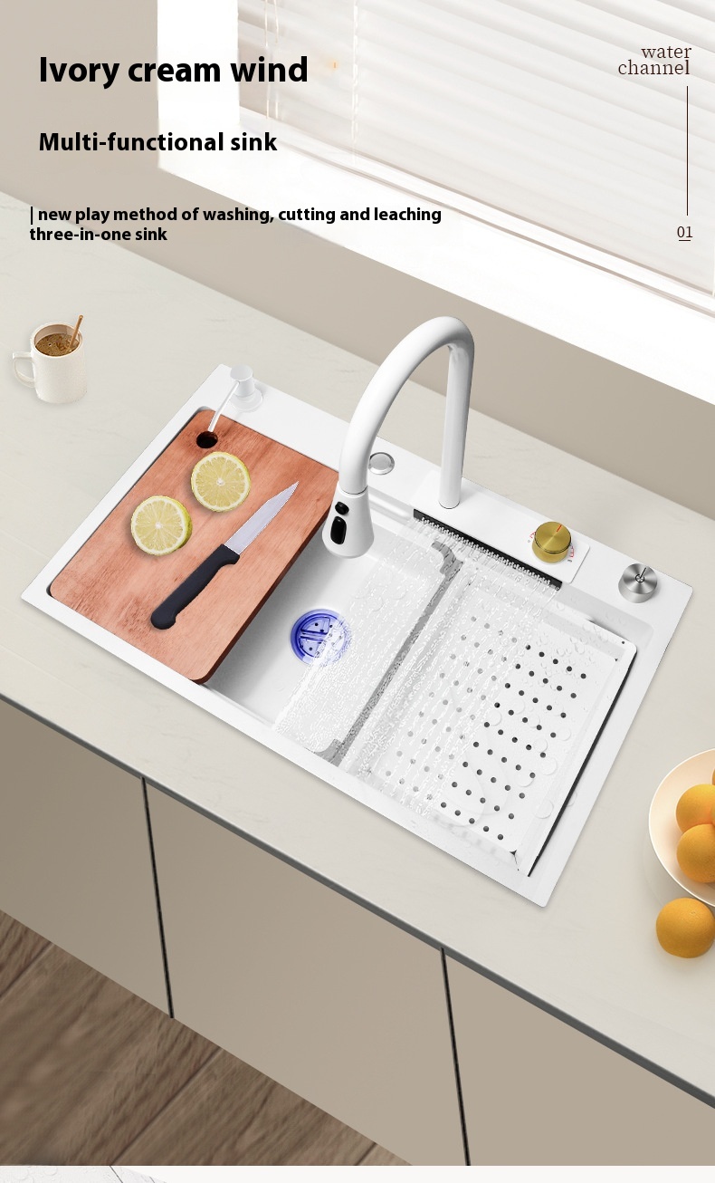 The ESMark™ White Nano Stainless Steel Kitchen Sink combines elegance and functionality, offering a stylish ivory cream design with a multi-functional sink that integrates washing, cutting, and draining into one. Made from high-quality 304 stainless steel and featuring a nano surface treatment, this sink resists corrosion, stains, and oil, making it durable and easy to clean. Its flexible design provides versatile usage, making it perfect for modern kitchen tasks.