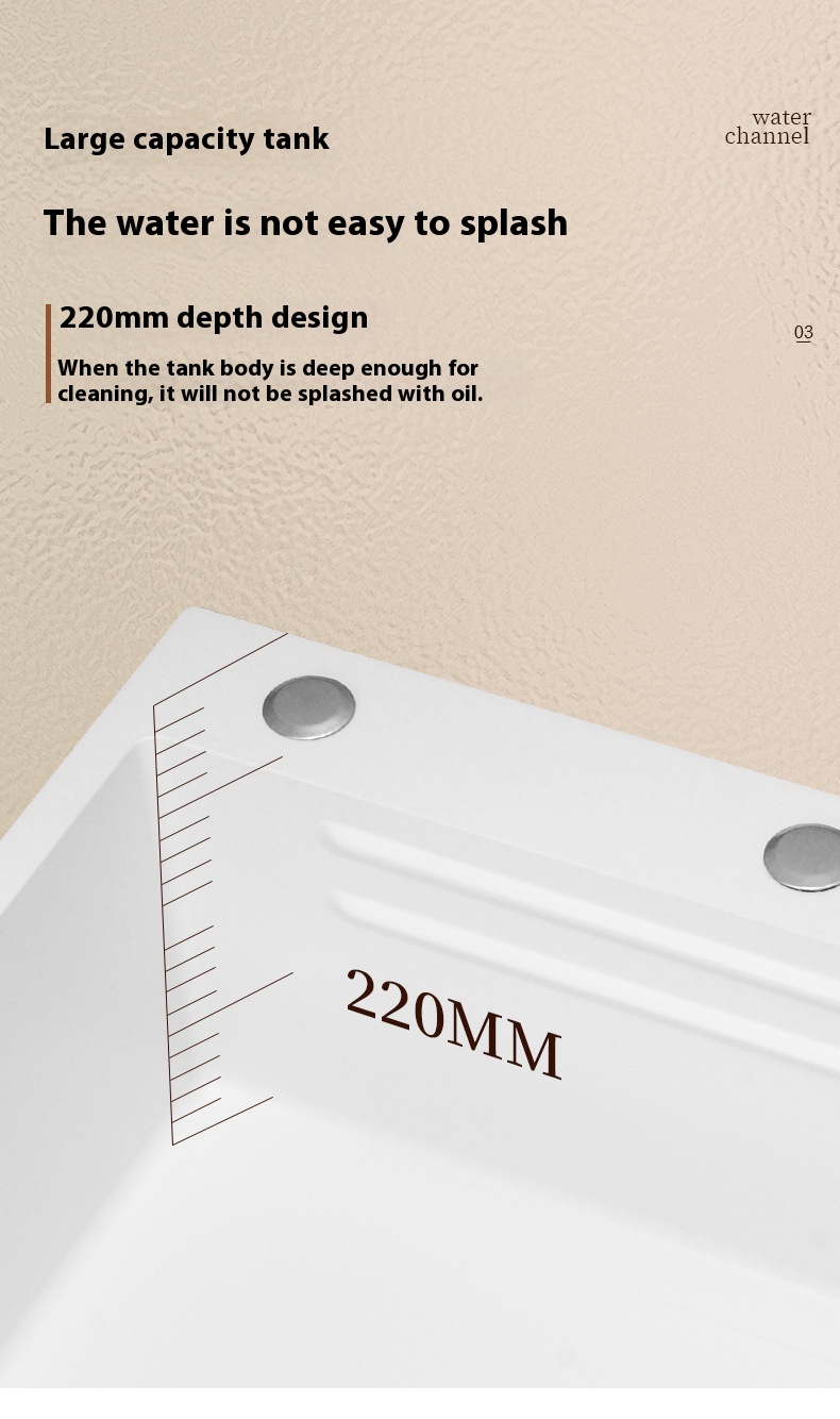 Large Capacity Basin: With a 220mm deep design, this sink provides ample space for washing large pots and pans. Its anti-splash design ensures that no water spills during cleaning. The side drain hole frees up additional space underneath for storage.