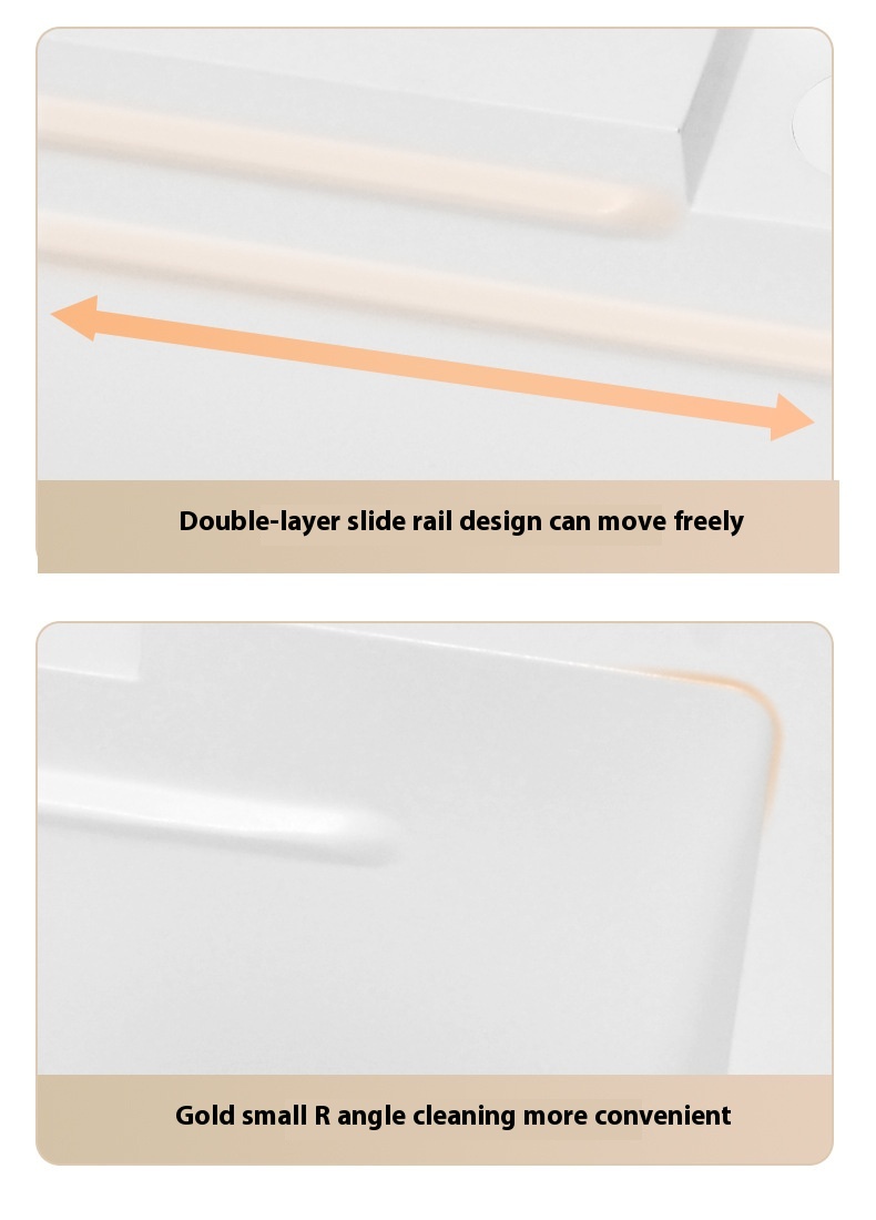 Double-Layer Sliding Rail: The double-layer slide rail inside the sink allows easy movement of the cutting board and drainer basket. It features a gold R-angle design for easy cleaning and sleek aesthetics, blending fashion with functionality.