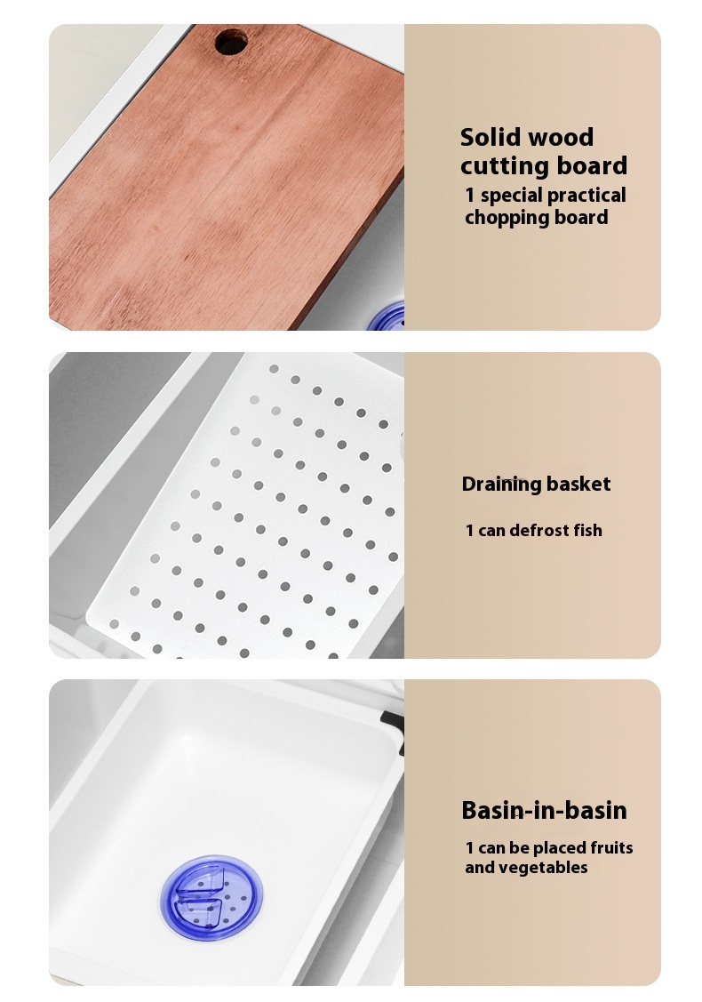 Multi-Functional Design: This sink is a three-in-one solution for washing, cutting, and draining. It features a built-in sliding system allowing you to move the drainer basket and cutting board as needed. Whether you’re washing fruits and vegetables or draining food, this sink provides efficiency and convenience.