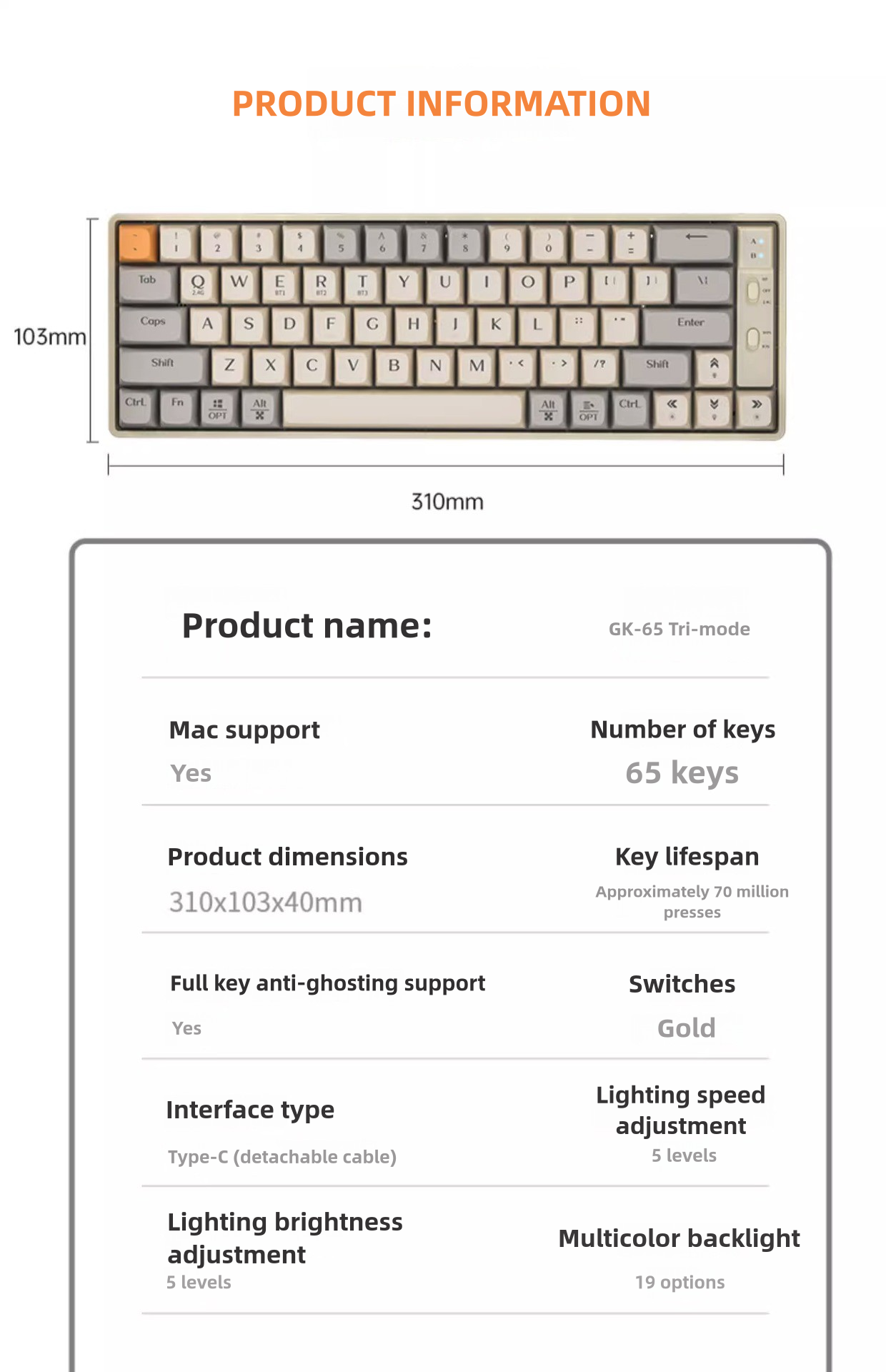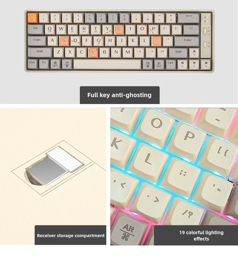 GK65 Wireless Mechanical Gaming Keyboard – Triple Mode (2.4G/Bluetooth/USB), 19 RGB Backlight Effects, N-Key Rollover, Mac/Win Compatible
